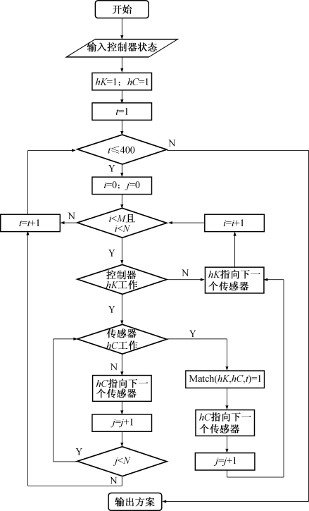 模型特点是每个时间节点的匹配方案与前一个时间节点的最后一个匹配位置相关,即有记忆性,而且对每个控制器和传感器来说是相对公平的,因为控制器数和传感器数相差很大,这样的匹配是相对随机的,例如现实生活中银行的排队方式就是类似的例子。而且时间间隔的相对均衡性也得到了很好的满足,因为队列长度都是差不多的。问题中控制器无工作状态的限制,只要顺次取出控制器即可,由于是一对一的关系,只要找到一个传感器可匹配即可。根据编程思想作出如下流程图: