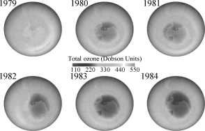 Figure 1 show the growing hole in the ozone layer over Antarctica for each October from 1979 to 1984.