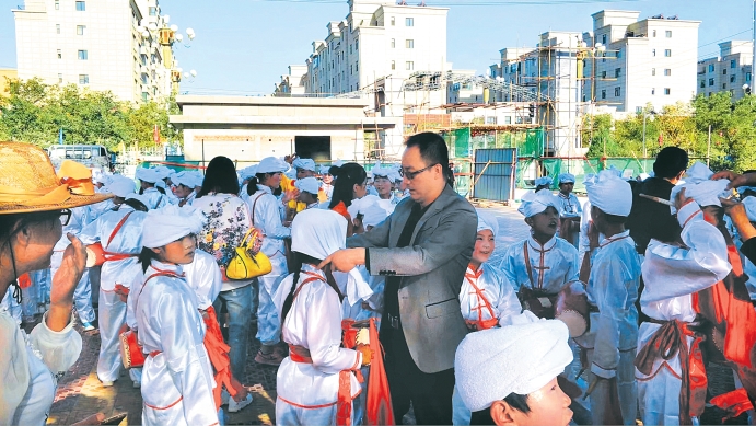 乡村少年宫腰鼓组的辅导老师在指导孩子们如何戴好白毛巾