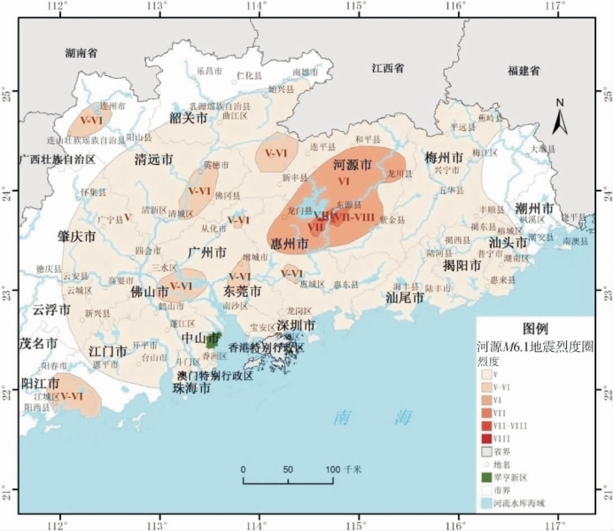 有感范围西至清远、恩平一带,判定中山市中心城区最大影响烈度为Ⅴ度。