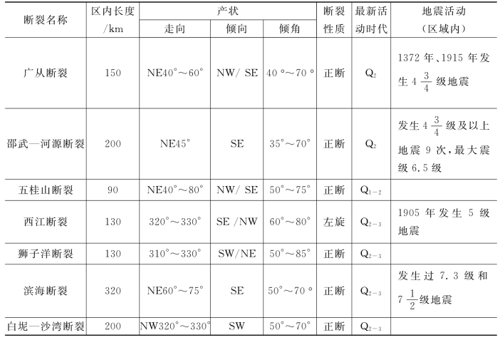北东向断裂是区内最醒目的断裂,它遍布于全区,由东而西有:政和—海丰断裂、邵武—河源断裂、从化—阳江断裂、吴川—四会断裂,等等。这些断裂规模宏大,延伸数百千米,大多生成于印支期,强烈活动于燕山期,沿断裂分布有中新生代断陷盆地。控制大型山脉、水系的发育和花岗岩的侵入,断裂的动热变质现象显著,沿断裂有基生岩全和温泉出露,表明它们是切割较深的深、大断裂,控制两侧地质发展历史,往往是一、二级大地构造单元的分界线。地震震中分布表明,强震沿断裂呈条带状分布,是一组控制强震震中空间分布的控震构造,成为地震带划分的地质构造基础。