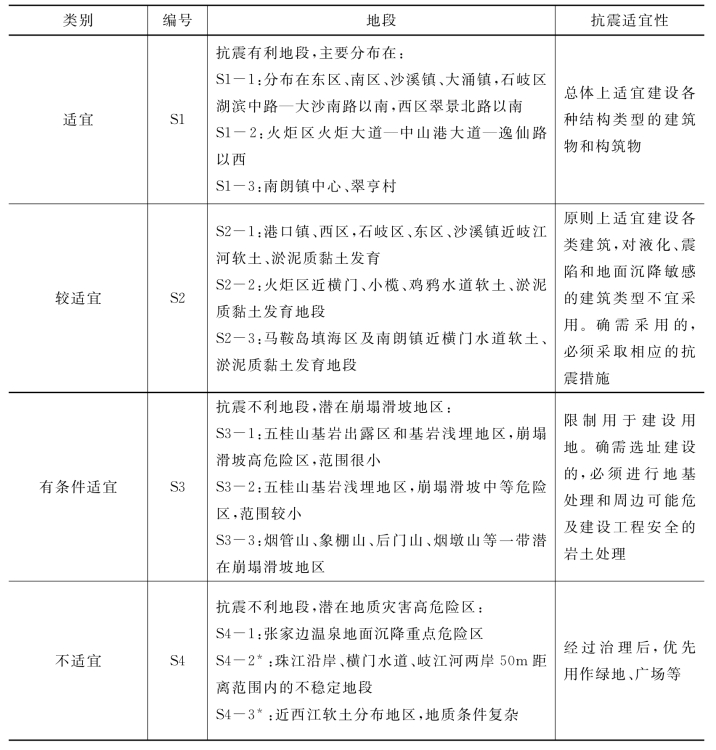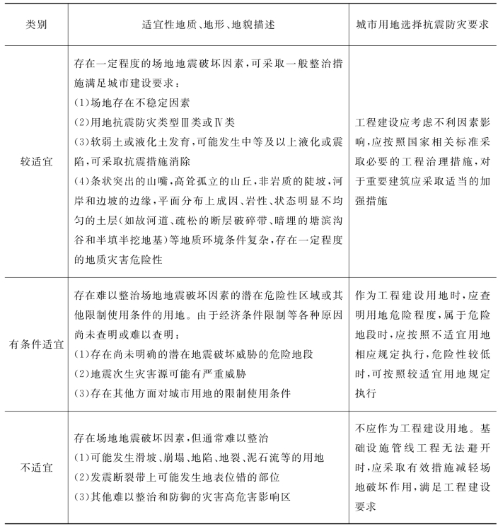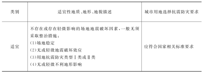 注:1.根据该表划分每一类场地抗震适宜性类别,从适宜性最差开始向适宜性好依次推定,其中一项属于该类即划为该类场地。