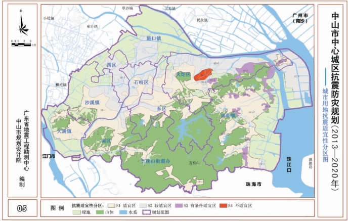 4)不适宜区。面积约3.16km2,占全区面积1.4%,位于张家边温泉地面沉降重点危险区和马鞍岛二期填海区,并取珠江沿岸、横门水道、岐江河两岸不稳定地段50m距离的范围内及近西江软土分布地区为抗震不适宜区域。