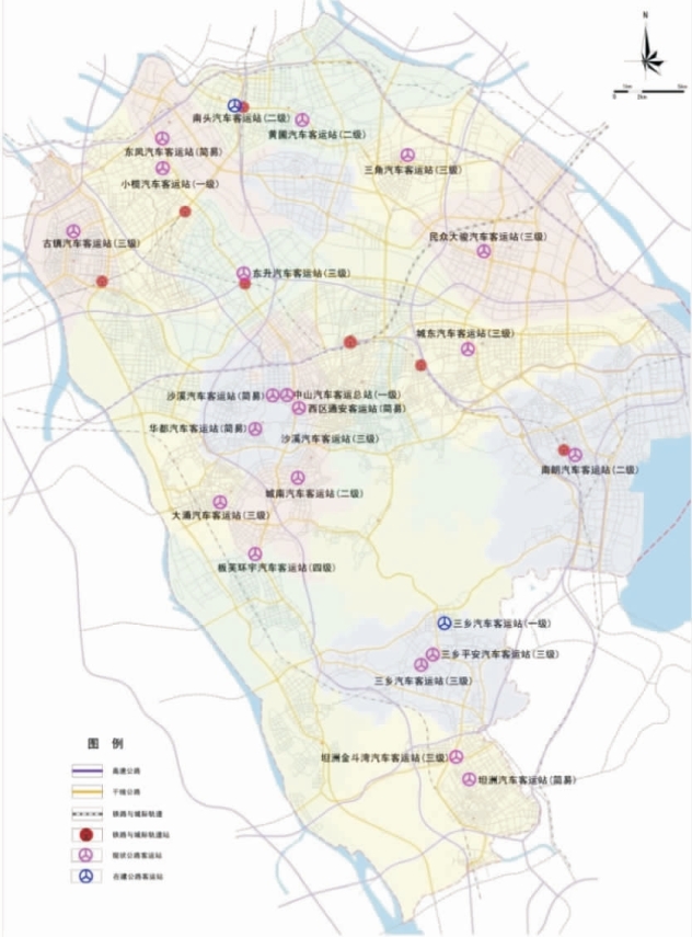 截至2013年年底,规划区内的公路长途客运站有8个,其中一级客运场站2个、二级客运场站1个、三级客运场站1个、简易客运站4个(参见图5-2)。