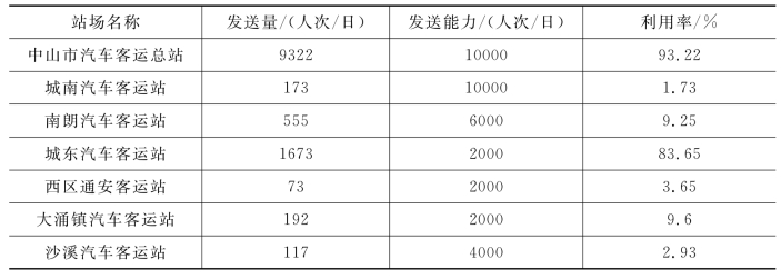 表5-1给出了规划区内现状客运站场的车站利用率状况。从数据上看,规划区内汽车客运站站场利用率整体偏低,仅中山市汽车客运总站、城东汽车客运站等利用率较高,站场的利用率存在一定的不均衡。在后期规划时,应考虑进行适当的调整与改善。