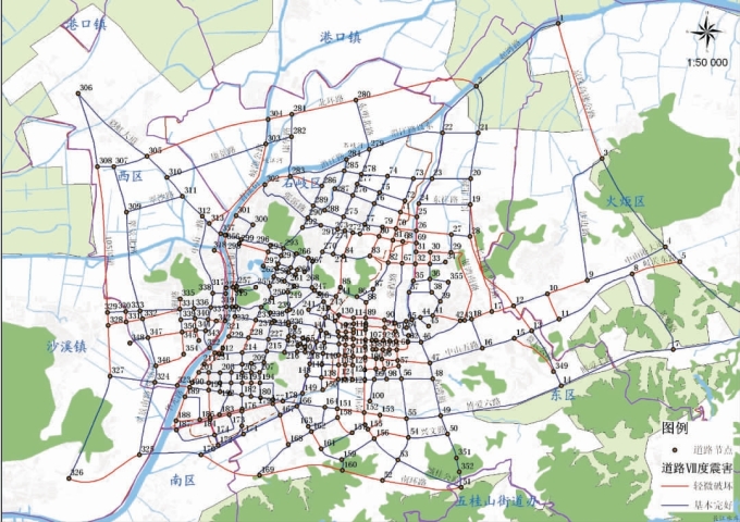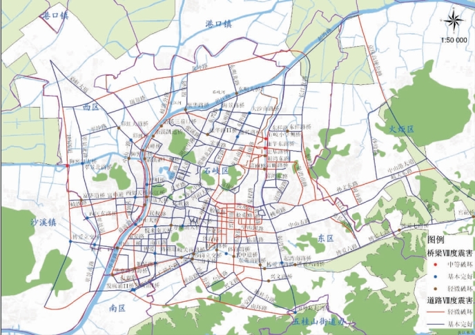 总的来说,道路、桥梁的破坏多发路段多分布于岐江、河涌两侧,以及易发生砂土液化的区域和Ⅲ类场地分布区域。