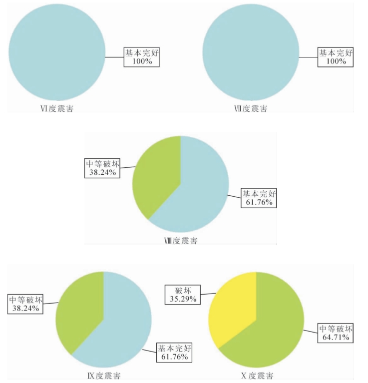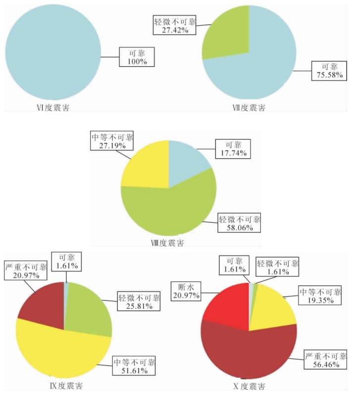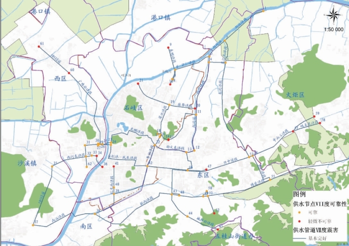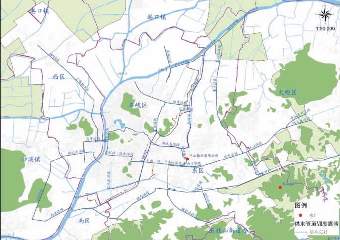 分析结果表明,供水管段基本具备抵御Ⅶ度烈度震害能力。Ⅷ度时,部分发生中等破坏;Ⅹ度时,由于地震动作用、建设年代、管径、管材、场地类别和场地地震地质灾害等一系列因素的影响,多数发生了中等程度的破坏。但总体而言,中山市供水系统具有较好的抗震可靠性。