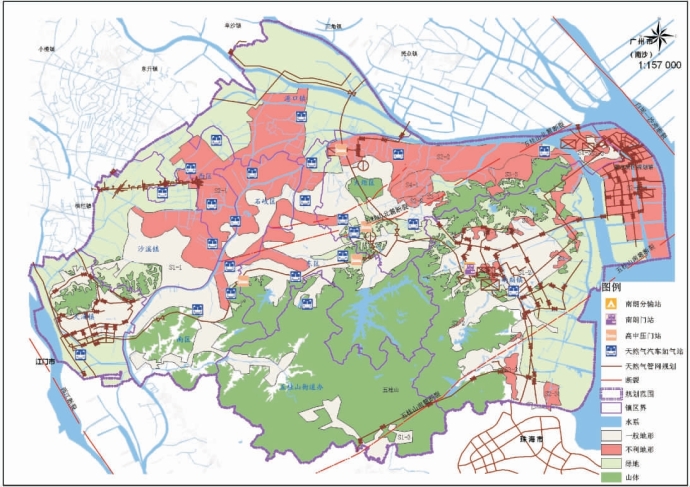 新建的供气场站(门站、压气母站、高中压调压站)、供气管道应按Ⅶ度进行抗震设防。配电设备、机电设备和其他固定机械设备与底座应设置螺栓锚固或采取其他限位措施,以避免地震中发生位移或倾倒。根据《中山市城市总体规划(2010—2020年)》天然气管网规划,规划天然气管道将穿越火炬区、南朗镇、马鞍岛等镇区的抗震不利地段(见图5-21),规划天然气汽车加气站也设置在石岐区、西区、南区、火炬区、港口镇等镇区的抗震不利地段,这些地段在地震发生时可能会出现地基土液化、软土震陷等地震地质灾害。部分管道还跨越五桂山北麓断裂和五桂山南麓断裂,断层的错动将造成管道的严重破坏。新建管道和加气站应尽量绕避上述抗震不利地段及断裂,如不能绕避,则应根据五桂山断裂活动性研究结果、《室外给水排水和燃气热力工程抗震设计规范》(GB50032-2003)和《建筑抗震设计规范》(GB50011-2010),采取有效的抗震措施。供气管道和加气站应远离人口稠密处,同时,须考虑必要的切断和排放措施。在中压和进户及高层建筑上行管、公建,餐饮用户等人群密集场所均应设置紧急切断阀。供气管道应采用柔性管材和柔性连接方式。当供气管道穿越建(构)筑物的墙体时,应采取适当的加固措施。供气管道应布置成多回路、环状管网,以便多向供应,也便于灾时的抢修。已建燃气系统中设备的抗震措施,应结合设备的维修改造,于近期内达到抗震要求。