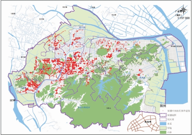 根据第6次全国人口普查数据可知,中山市中心城区共有住家42677户,户籍人口数为594784人,现有房屋总建筑面积约4500万m2。中山市主城区于2009年完成了震害预测,普查一般建筑物48307栋,总建筑面积约3379.24万m2;抽样调查一般建筑物2041栋,总建筑面积约768.18万m2,约占一般建筑物总建筑面积的22.73%;分析重要建筑物59栋,总建筑面积约50.28万m2;分析典型高层建筑15栋,总建筑面积约25.6万m2。2012年夏季和2013年春季,中山市开展了全市房屋安全大检查,累计普查规划区内一般建筑物55709栋,总建筑面积约2356.59万m2。2014年3月,完成了规划区抗震防灾规划的编制,抽样调查一般建筑物231栋,总建筑面积约30.26万m2;2014年4月,完成了中山市建(构)筑物抗震性能普查,共普查规划区内一般建筑物9426栋,总建筑面积约6374万m2。中山市中心城区内建筑物抗震调查分布见图6-1所示。
