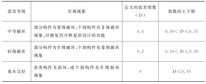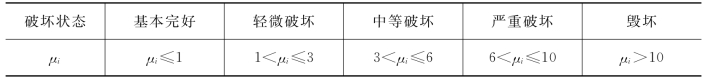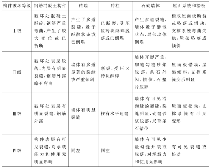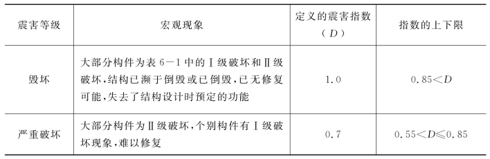 房屋的破坏通常是由构件及其连接的破坏引起的,其震害程度取决于其各组成构件的破坏情况。根据构件的破坏等级,可评定出房屋的震害等级。通常,房屋的震害等级分为5级:毁坏、严重破坏、中等破坏、轻微破坏和基本完好。关于结构构件破坏状态,和建筑结构整体破坏状态,通常按照表6-1和表6-2所列的标准划分。