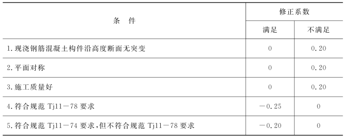 其中:Ck——修正系数,见表6-7;楼层最大延伸率平均值与破坏状态对照见表6-8。