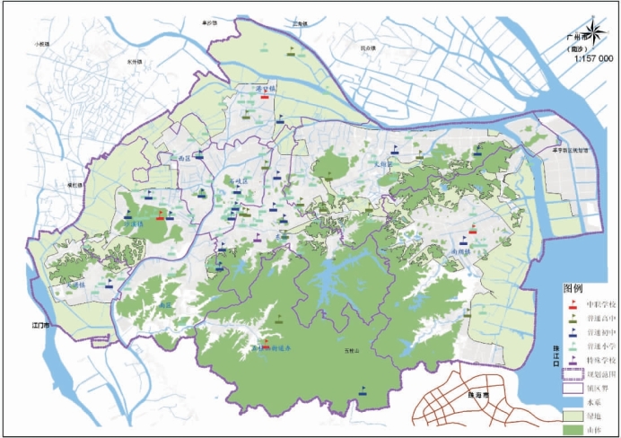 中山市中心城区内有全日制普通小学83所,在校学生85428人;有普通初中19所(含九年一贯制学校5所),在校学生34193人;有全日制普通高中14所(含8所完全高中、3所十二年一贯制学校),在校学生45342人;有中职学校4所,在校学生10397人;有特殊学校1所,在校学生381人。规划区内学校分布见图6-4。