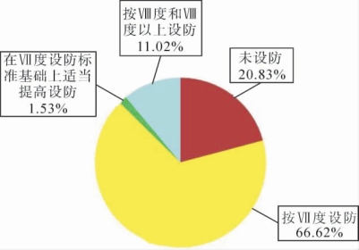 2012年,中山市完成了2009年启动的中小学校舍安全工程3年规划任务,完成了对中山市地震重点监视防御区、Ⅶ度以上地震高烈度区、洪涝灾害易发地区,以及山体滑坡和泥石流等地质灾害易发地区的各级各类城乡中小学校存在安全隐患的校舍进行抗震加固、迁移避险,提高综合防灾能力;其他地区按抗震加固、综合防灾的要求,集中重建整体出现险情的D级危房,改造加固局部出现险情的C级校舍,消除安全隐患,提升全市中小学校舍安全等级。中山市“全国中小学校舍安全工程”3年规划(2009—2011年)项目涉及24个镇区和市直属119所学校,其中公办学校104所、民办学校15所,总建筑面积79.74万m2。共重建新建49.6万m2,加固维修30.12万m2,总投入13.53亿元。中小学校单体建筑抗震设防情况统计见图6-5所示。