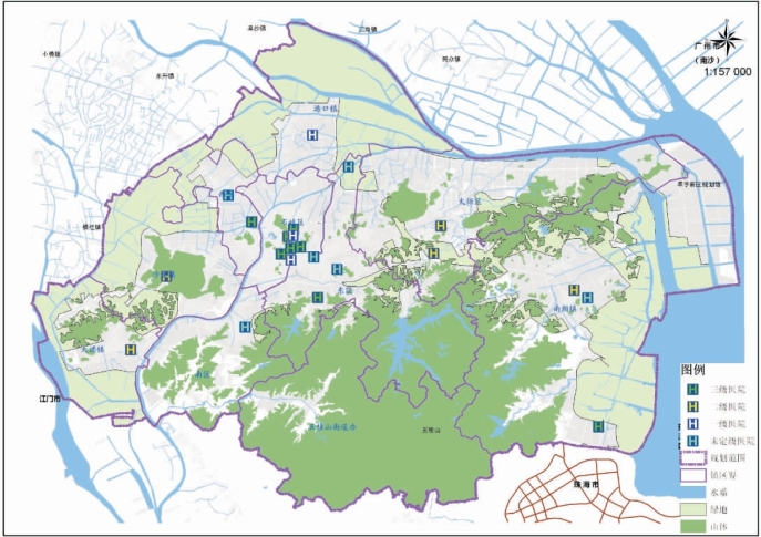 中山市中心城区内现有卫生医疗机构14个(不含门诊及社区服务站),其中综合医院4所、镇区卫生院9所,中山市人民医院、中山市中医院、中山市博爱医院为三级医院。全市基本形成了以公有制为主体、多层次、多形式的医疗卫生格局。规划区内现有医院床位总数6415张,全市人均床位数为5.22张/千人。中山市规划区内医院分布见图6-6。
