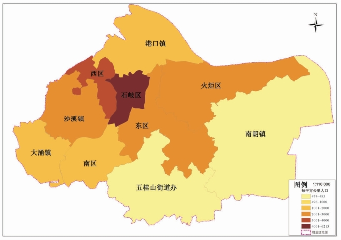 中山市中心城区有多处人口密集的居民区:石岐区的人口密度最大,达到6213人/km2;西区办事处的人口密度次之,达到3971人/km2;火炬开发区、沙溪镇的人口密度也在2000人/km2以上(参见图7-2)。这些居民区的建筑物密集、人口密度大、火灾隐患多,地震发生时,若稍有不慎,则局部火灾很容易酿成连片大火,造成扑救困难、损失巨大的后果。