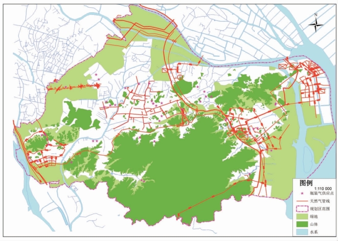 目前,中山市的城市燃气是以液化石油气为主,全市共有13座LPG储灌站和1座代天然气气源厂(最大生产能力11000m3/h),液化石油气储气能力为6250m3,平均日耗量450t。现状燃气气化率为98%,民用炊事用气以瓶装液化石油气为主,主城区、火炬区、沙溪镇及港口镇已供应管道代天然气。图7-9为中心城区内燃气工程规划图。对于使用管道供气的用户,用气软管、燃具、燃气报警设备和正确的燃气使用方法都关系到火灾发生的可能性,尤其震时用气器具的破坏、不能及时关闭燃气阀门,都会造成次生火灾的发生和蔓延。有关单位在平时应当加强相关知识的宣传及安全检查。