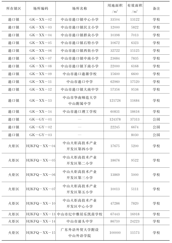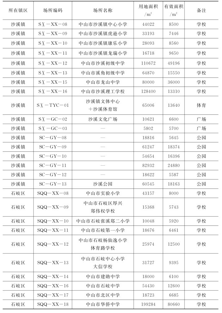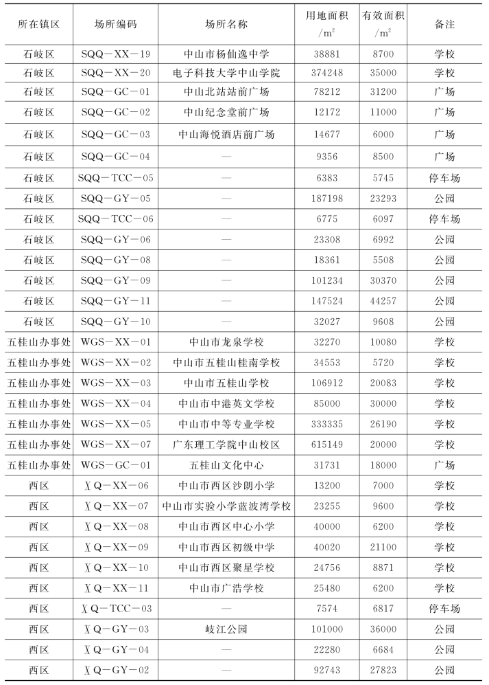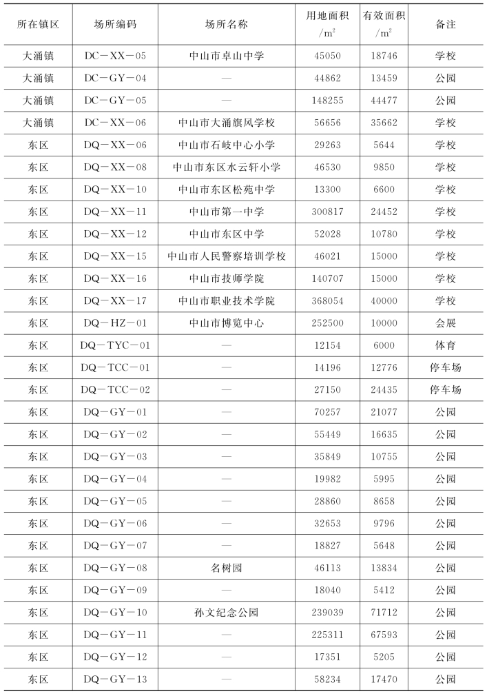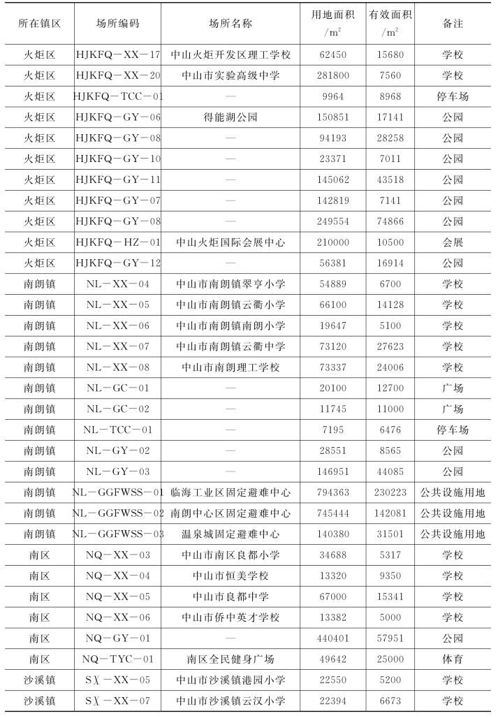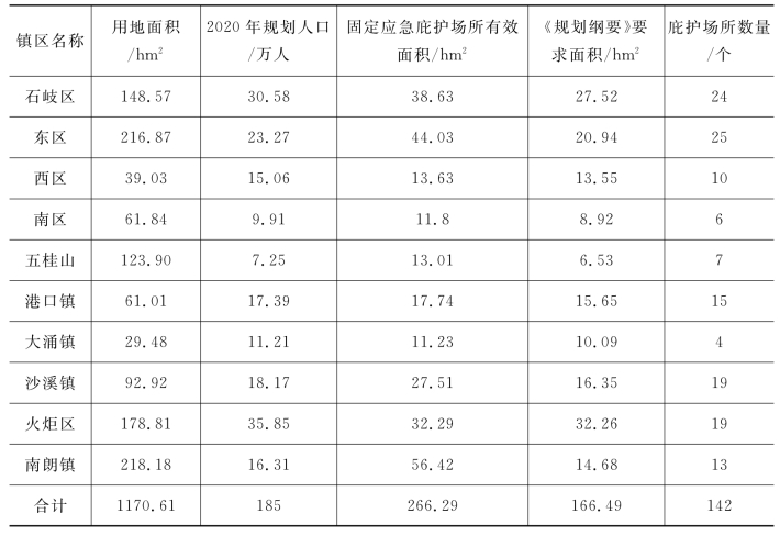 固定应急庇护场所主要依托中小型公园绿地、体育场馆、中小学及大专院校内操场设置,用地面积1170.61hm2,详见表8-4、表8-5所示。