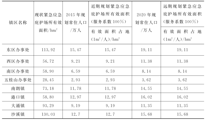 依据《中山市城市规划技术标准与准则(2010)》,对居住区、商业区及工业区进行测算,得出中心城区紧急应急庇护场所有效用地面积规划,结果详见表8-6。