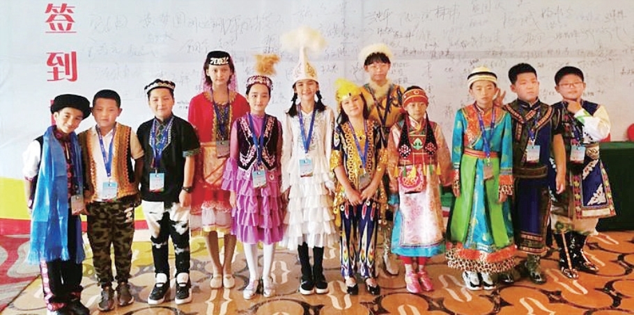 身着少数民族传统服装的小棋手们在签到处合影留念