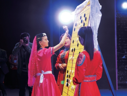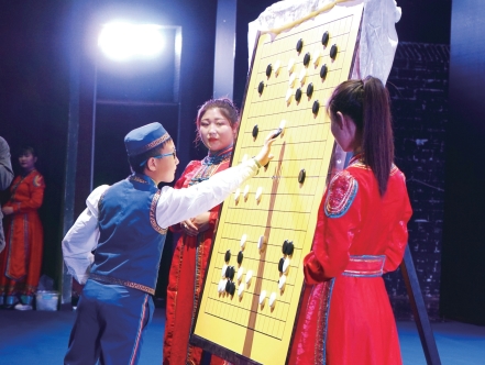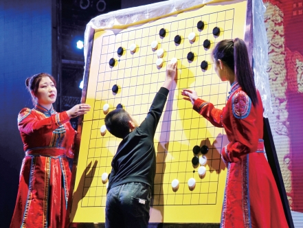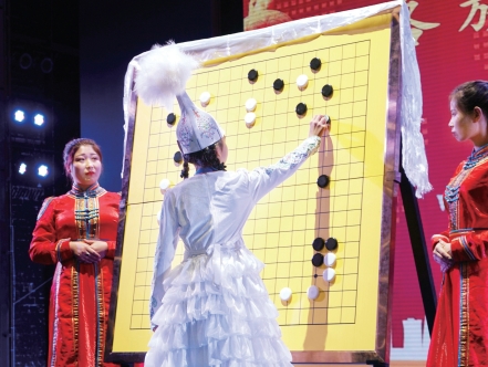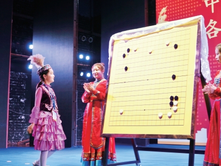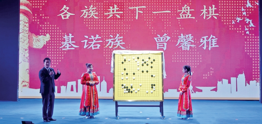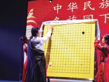 开幕式上,中国围棋协会副主席兼秘书长王谊主持“中华民族共同体,各族共下一盘棋”活动。全国56个民族各派出一位代表登台,在中央大棋盘上各落下一子。
