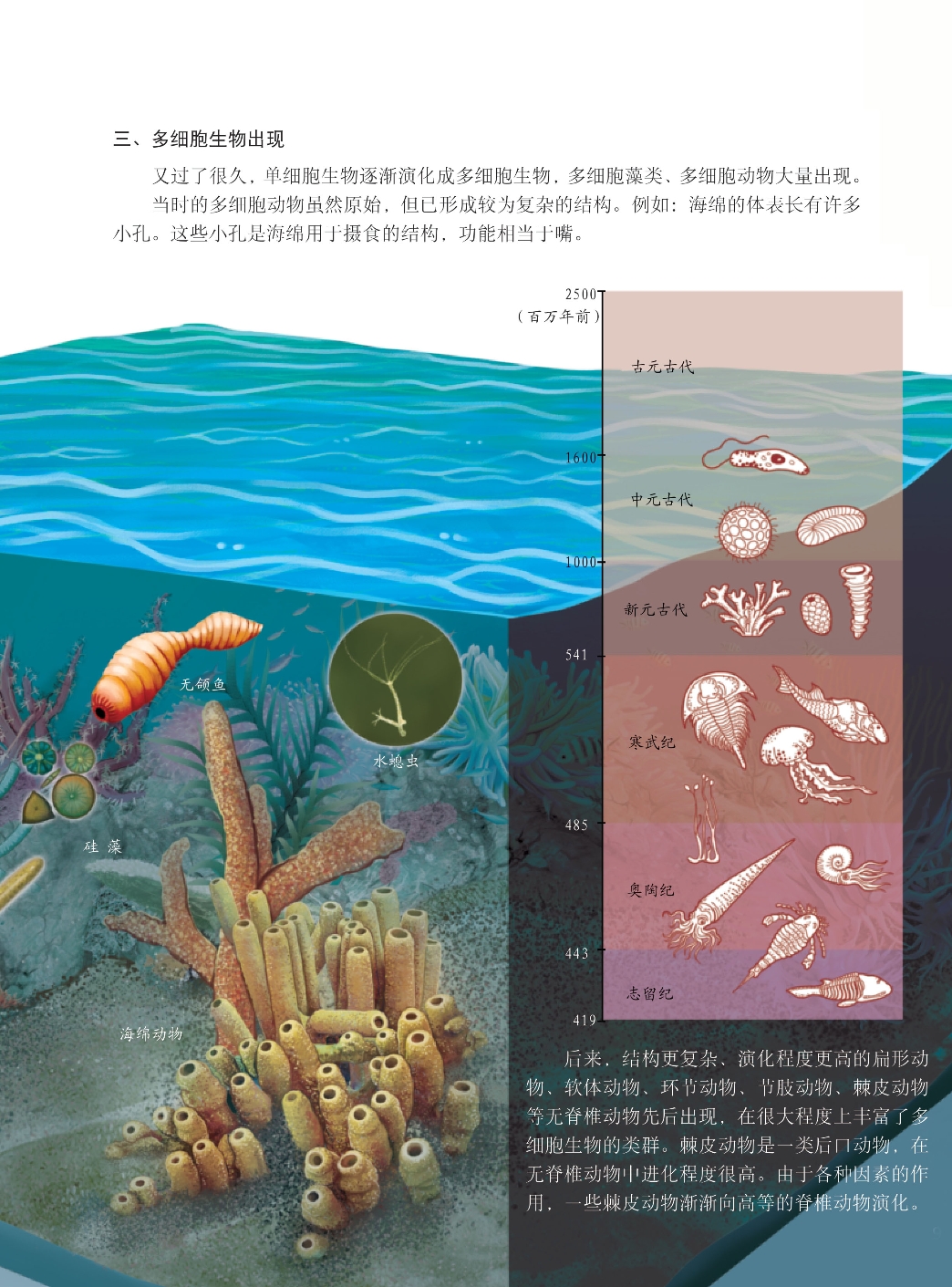 后来,结构更复杂、演化程度更高的扁形动物、软体动物、环节动物、节肢动物、棘皮动物等无脊椎动物先后出现,在很大程度上丰富了多细胞生物的类群。棘皮动物是一类后口动物,在无脊椎动物中进化程度很高。由于各种因素的作用,一些棘皮动物渐渐向高等的脊椎动物演化。