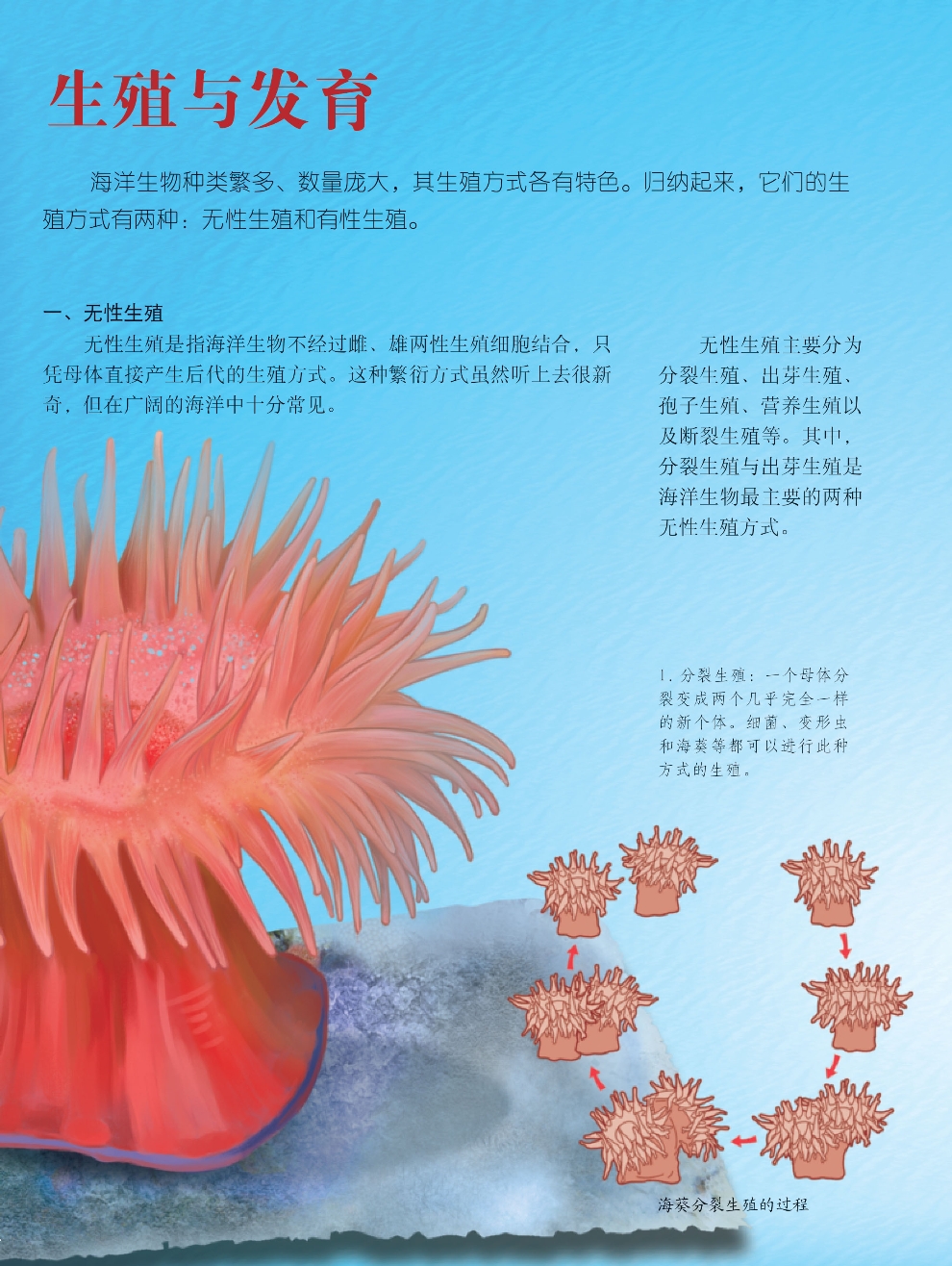 无性生殖是指海洋生物不经过雌、雄两性生殖细胞结合,只凭母体直接产生后代的生殖方式。这种繁衍方式虽然听上去很新奇,但在广阔的海洋中十分常见。
