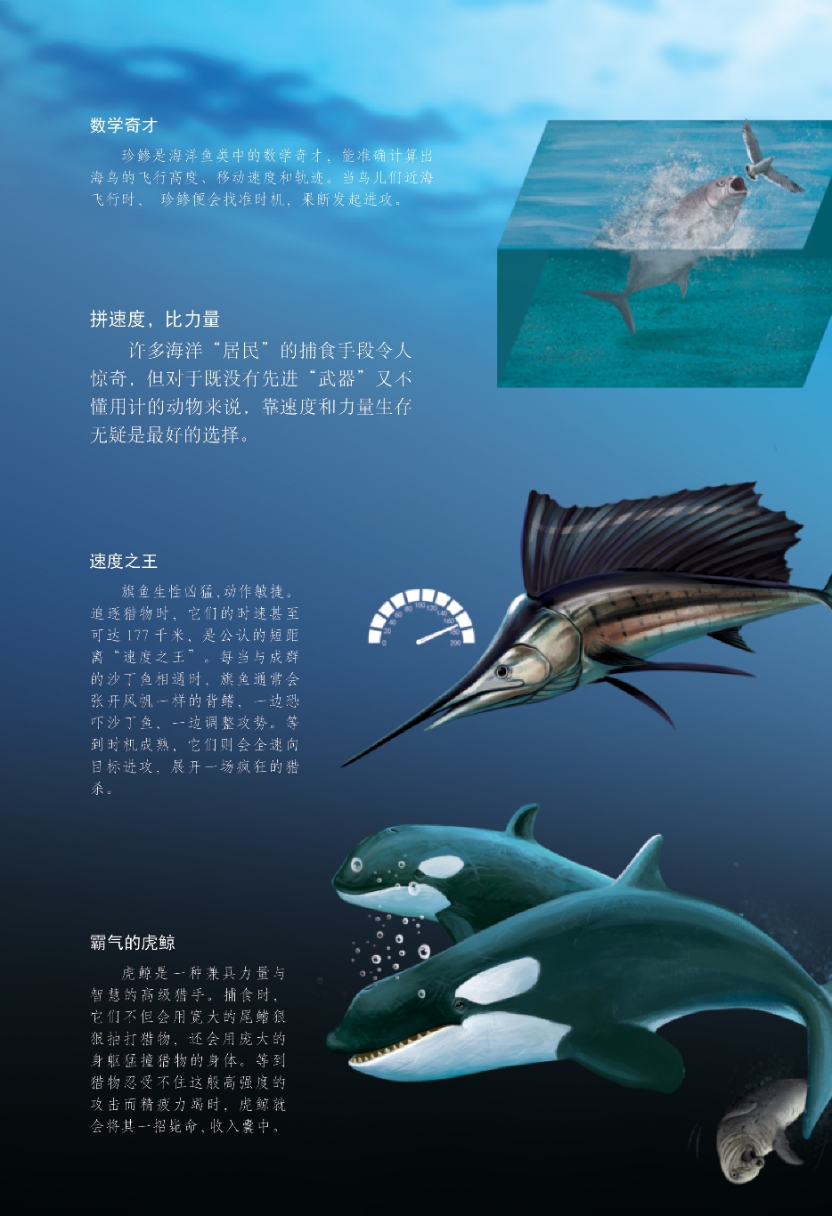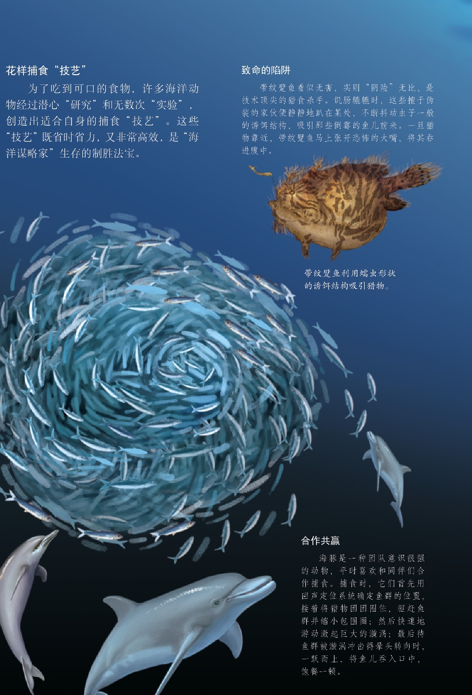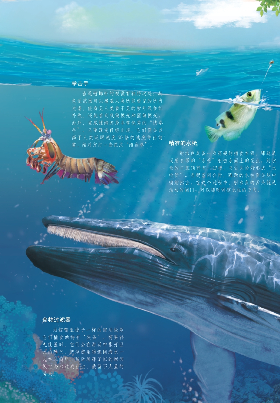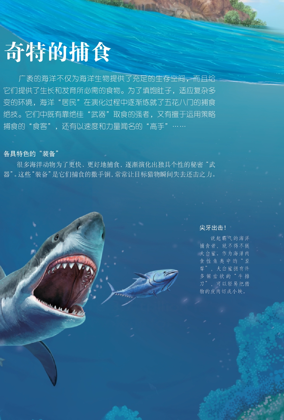 广袤的海洋不仅为海洋生物提供了充足的生存空间,而且给它们提供了生长和发育所必需的食物。为了填饱肚子,适应复杂多变的环境,海洋“居民”在演化过程中逐渐练就了五花八门的捕食绝技。它们中既有靠绝佳“武器”取食的强者,又有擅于运用策略捕食的“食客”,还有以速度和力量闻名的“高手”……
