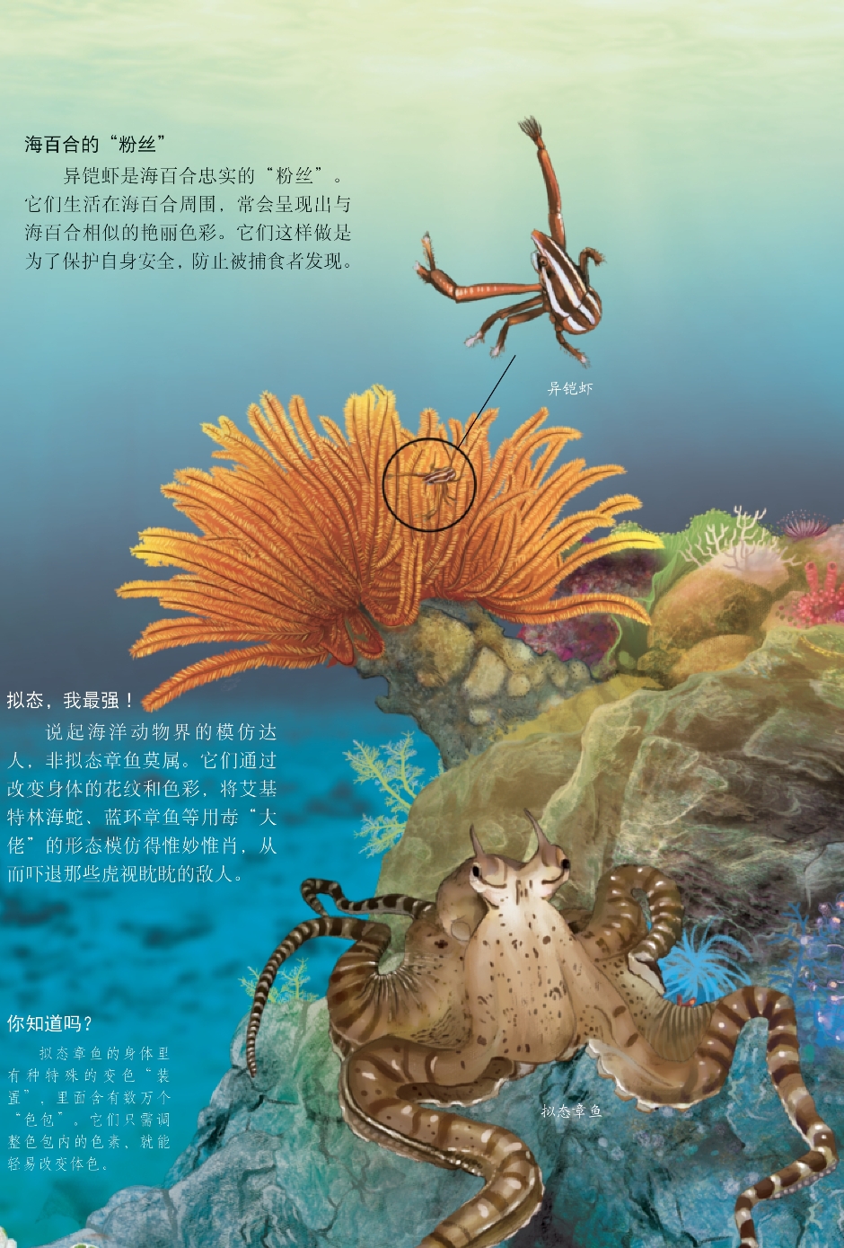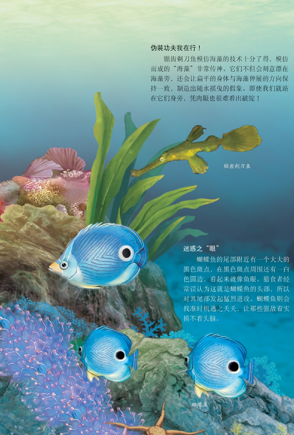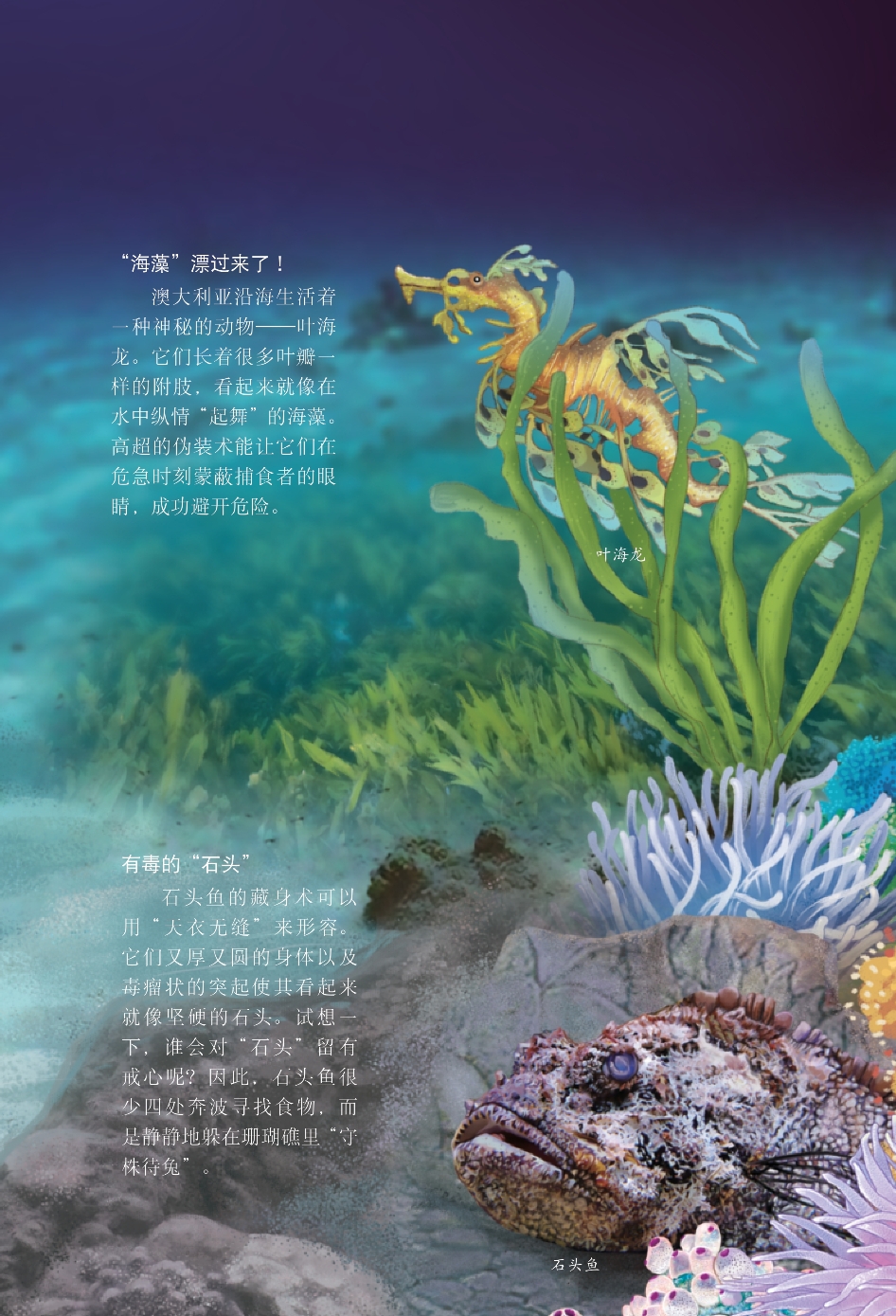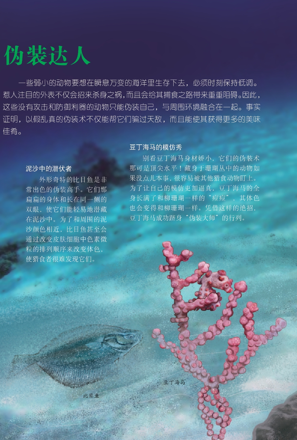 一些弱小的动物要想在瞬息万变的海洋里生存下去,必须时刻保持低调。惹人注目的外表不仅会招来杀身之祸,而且会给其捕食之路带来重重阻碍。因此,这些没有攻击和防御利器的动物只能伪装自己,与周围环境融合在一起。事实证明,以假乱真的伪装术不仅能帮它们骗过天敌,而且能使其获得更多的美味佳肴。