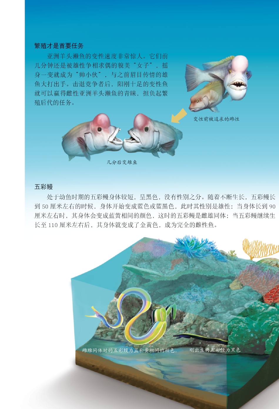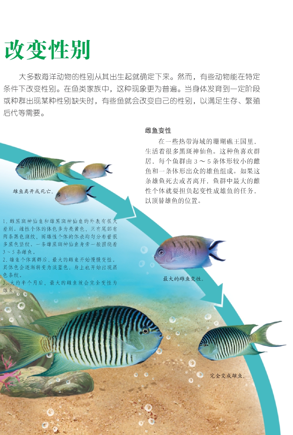 大多数海洋动物的性别从其出生起就确定下来。然而,有些动物能在特定条件下改变性别。在鱼类家族中,这种现象更为普遍。当身体发育到一定阶段或种群出现某种性别缺失时,有些鱼就会改变自己的性别,以满足生存、繁殖后代等需要。