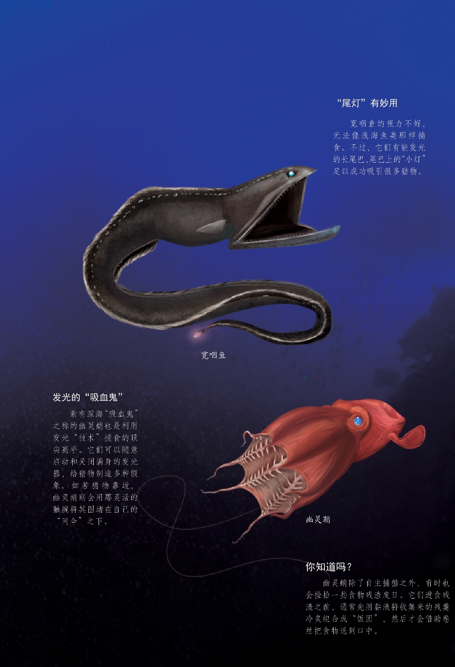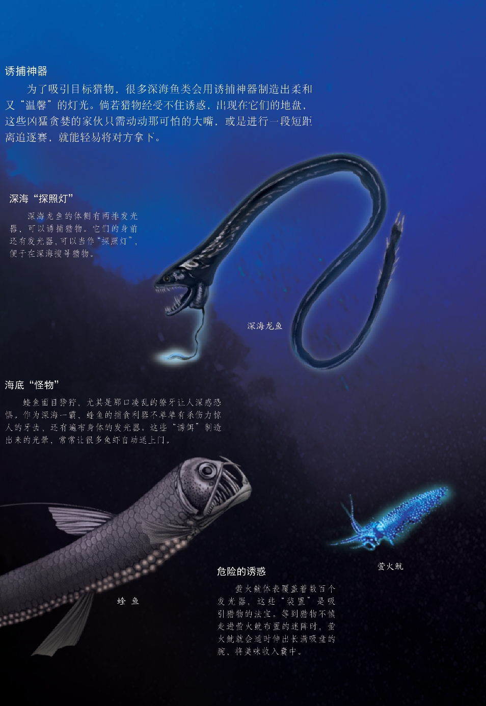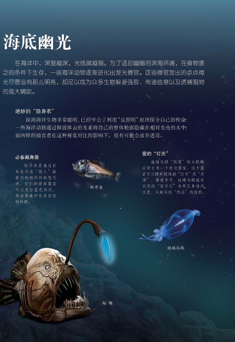 在海洋中,深度越深,光线就越弱。为了适应幽暗的深海环境,在食物匮乏的条件下生存,一些海洋动物逐渐进化出发光器官。这些器官发出的点点微光尽管没有那么明亮,却足以成为众多生物躲避强敌、传递信息以及诱捕猎物的强大辅助。