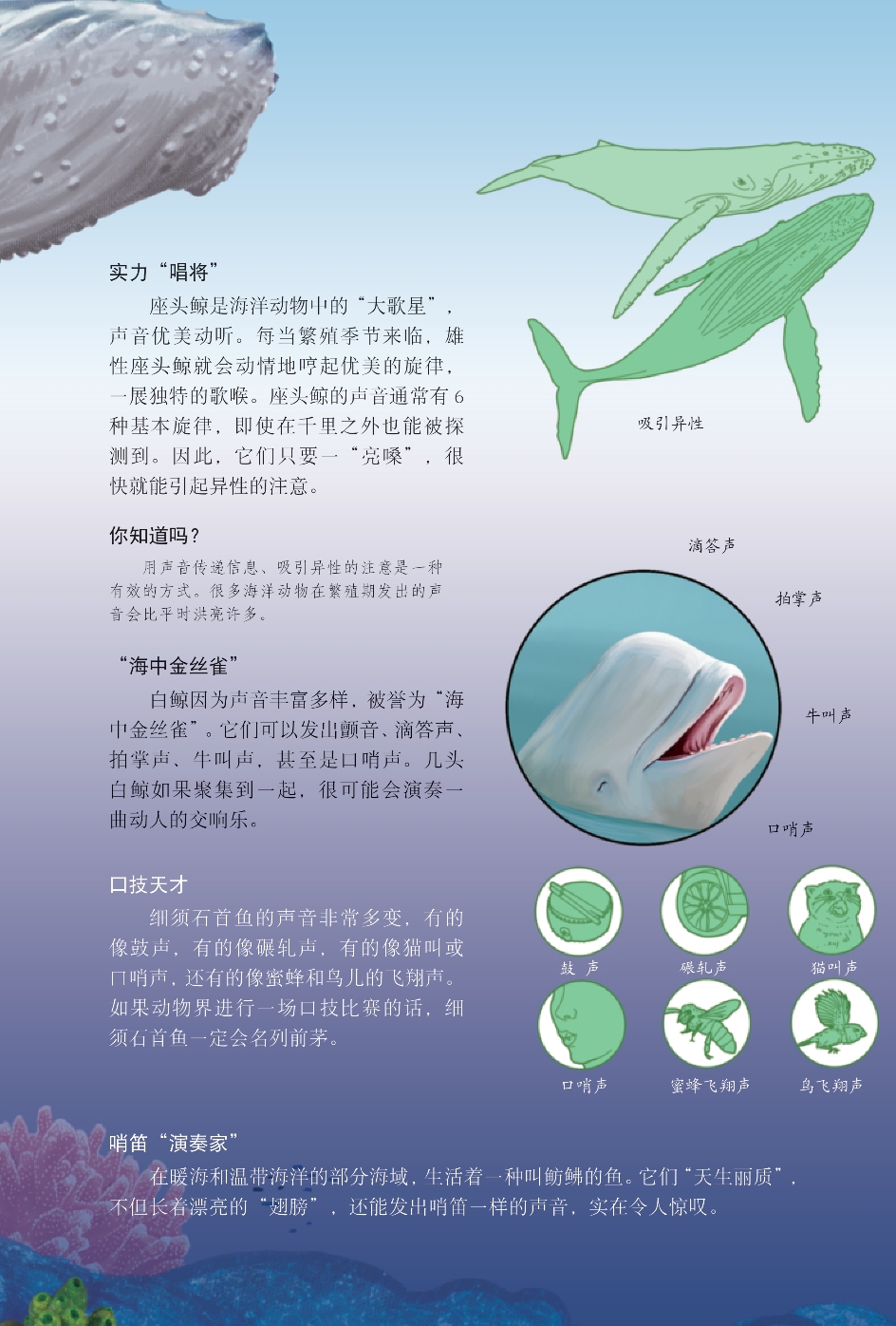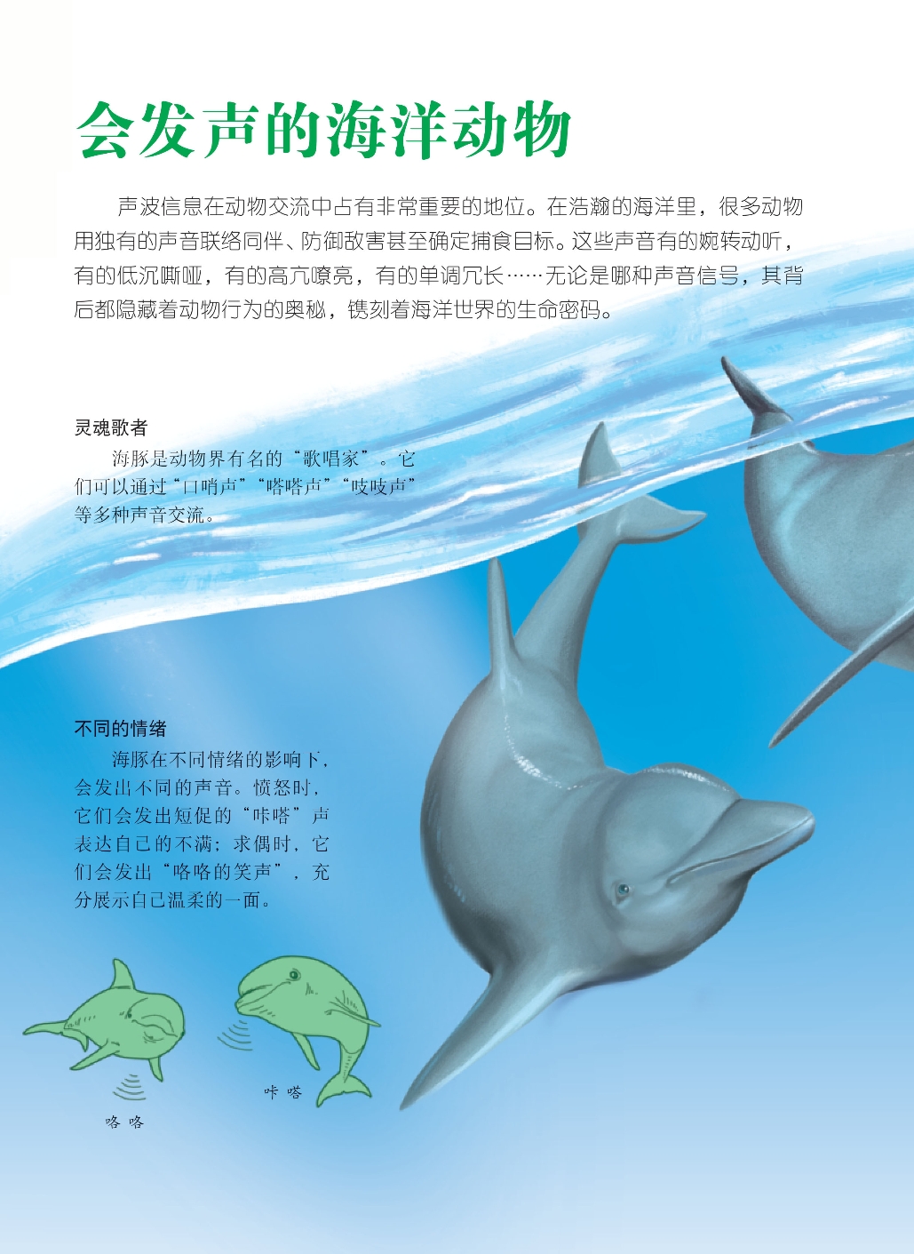 声波信息在动物交流中占有非常重要的地位。在浩瀚的海洋里,很多动物用独有的声音联络同伴、防御敌害甚至确定捕食目标。这些声音有的婉转动听,有的低沉嘶哑,有的高亢嘹亮,有的单调冗长……无论是哪种声音信号,其背后都隐藏着动物行为的奥秘,镌刻着海洋世界的生命密码。