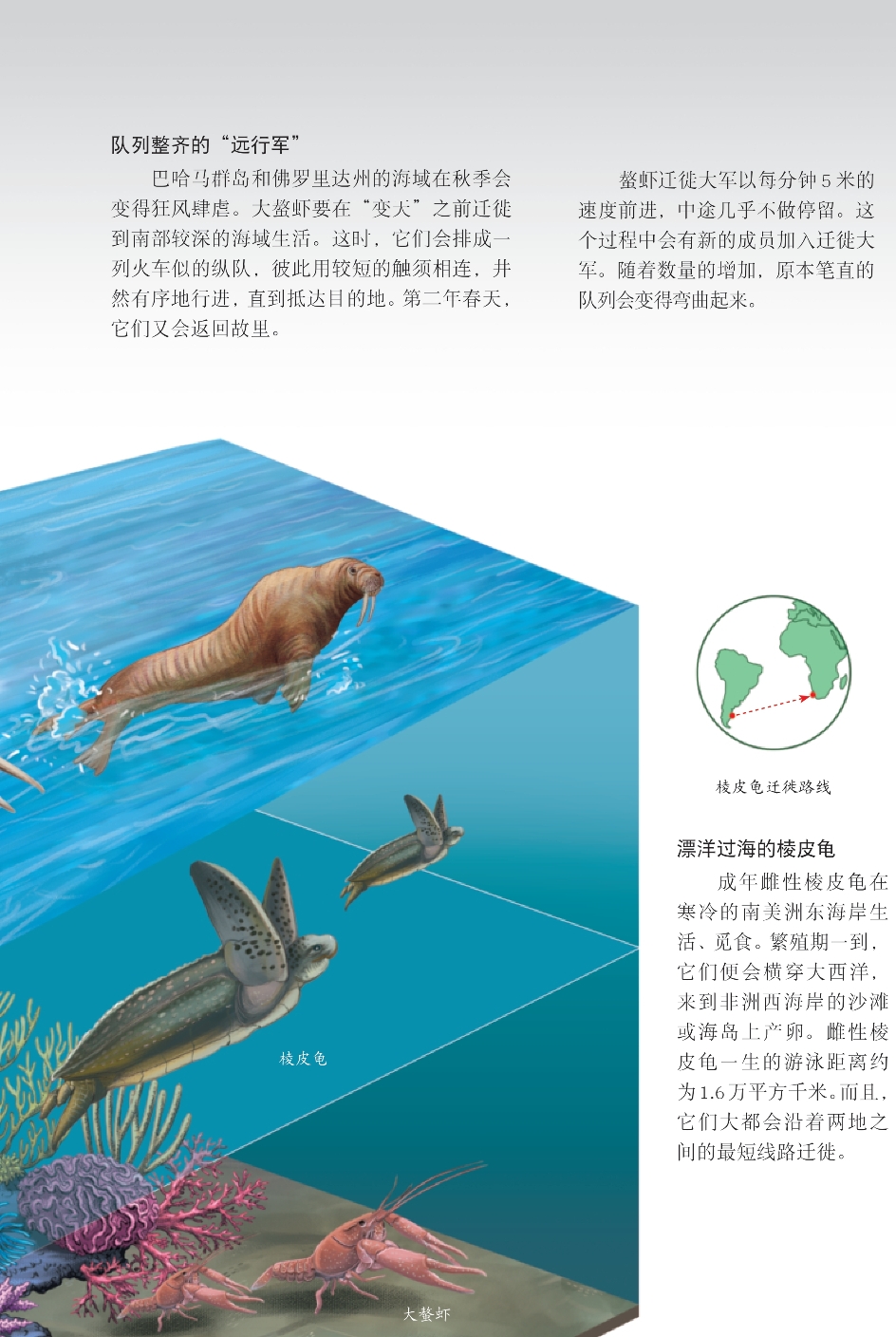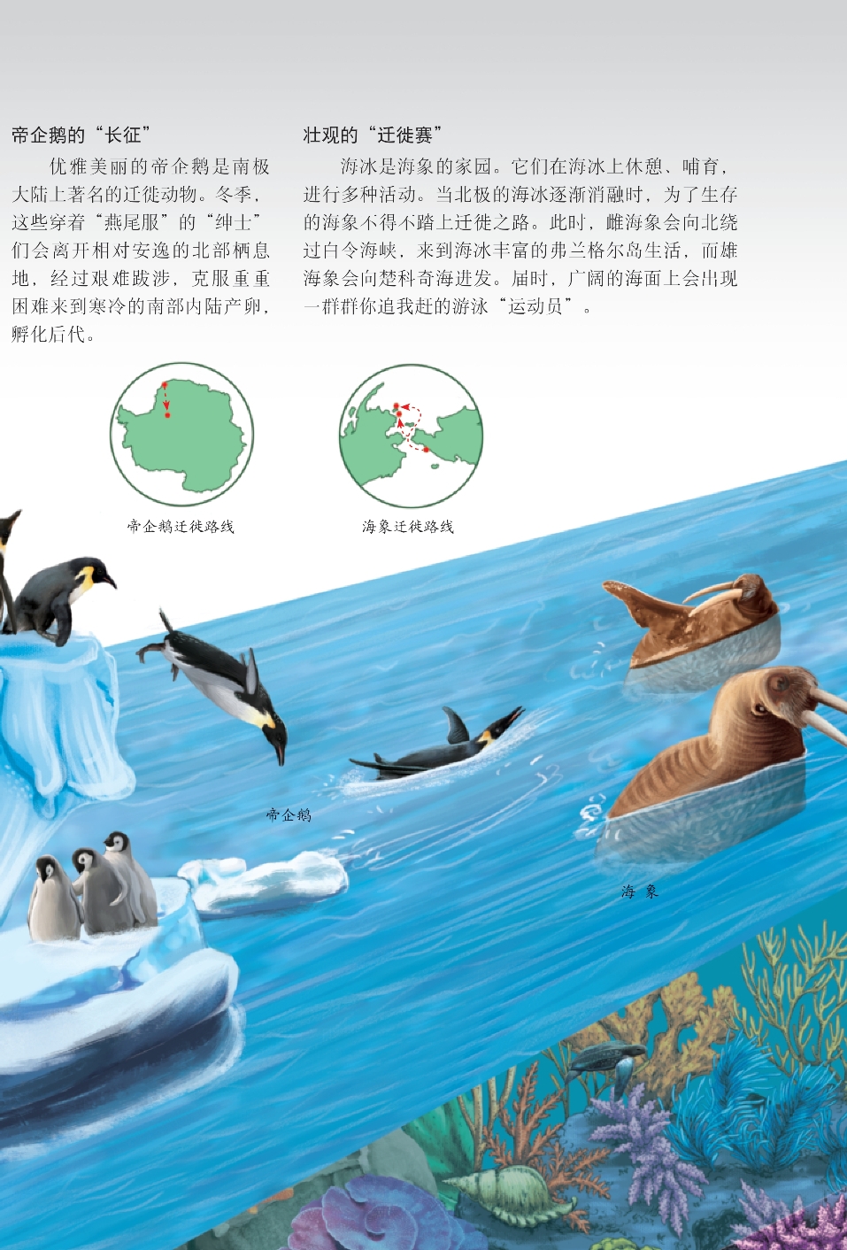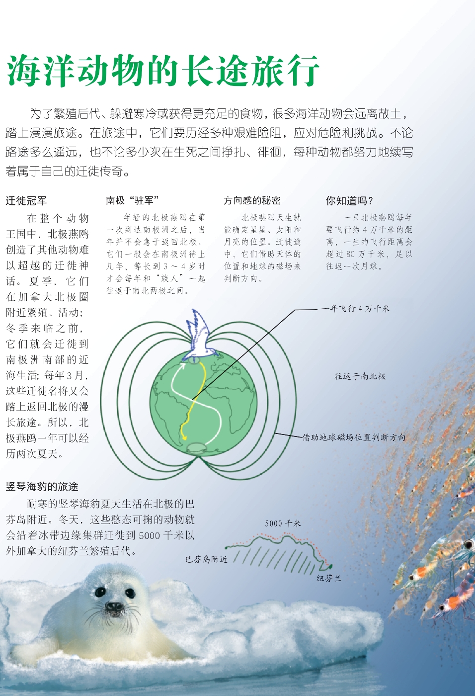 为了繁殖后代、躲避寒冷或获得更充足的食物,很多海洋动物会远离故土,踏上漫漫旅途。在旅途中,它们要历经多种艰难险阻,应对危险和挑战。不论路途多么遥远,也不论多少次在生死之间挣扎、徘徊,每种动物都努力地续写着属于自己的迁徙传奇。
