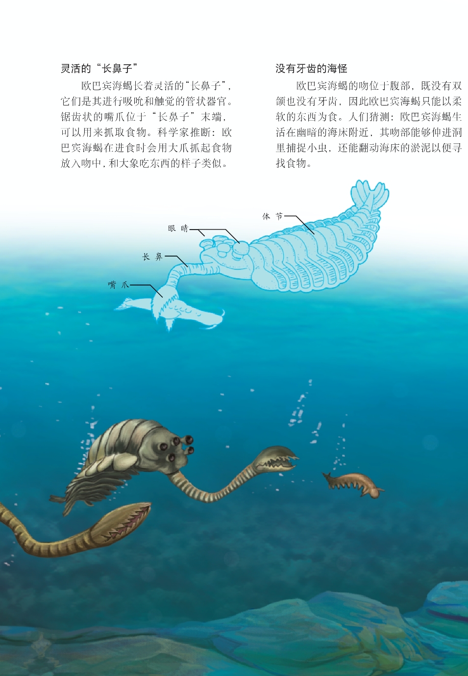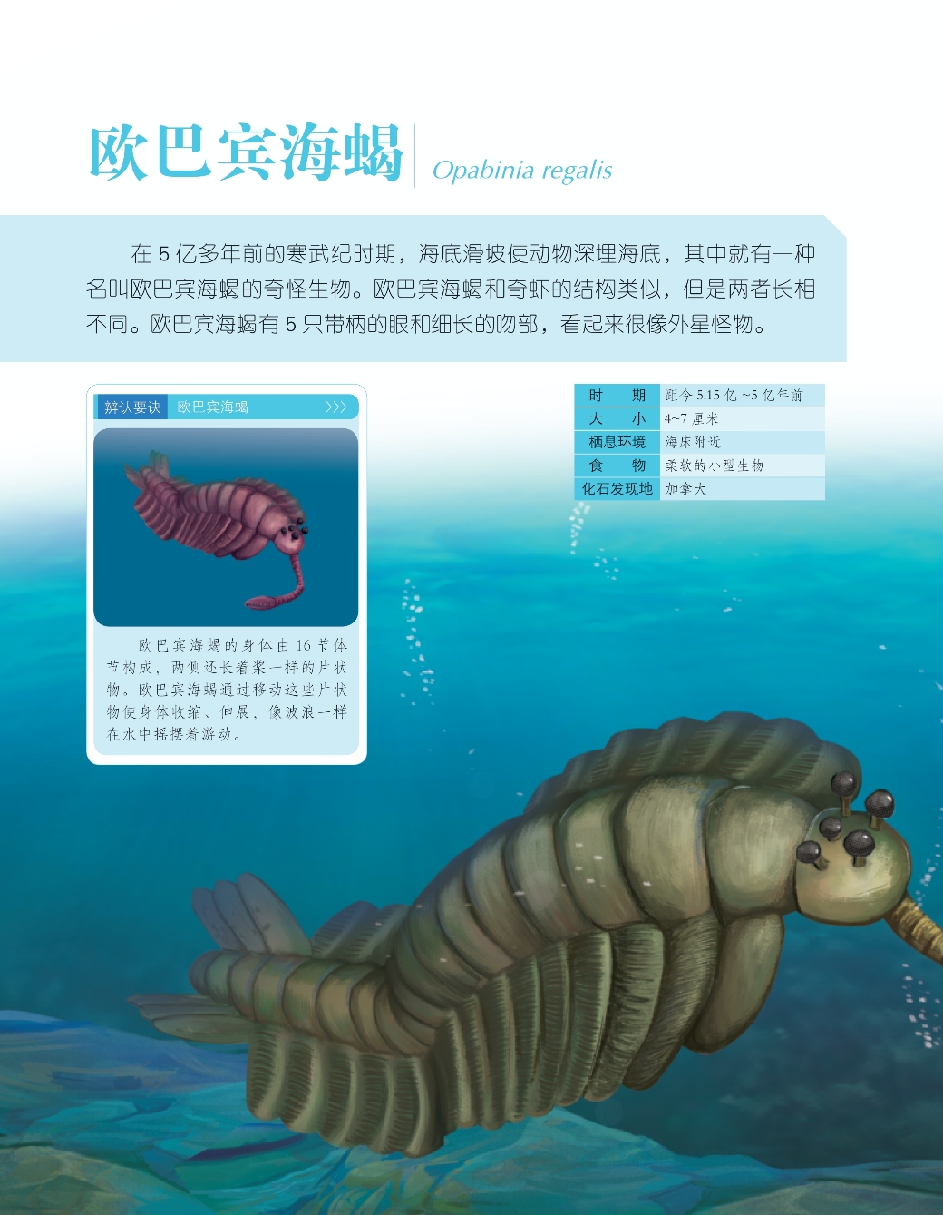 在5亿多年前的寒武纪时期,海底滑坡使动物深埋海底,其中就有一种名叫欧巴宾海蝎的奇怪生物。欧巴宾海蝎和奇虾的结构类似,但是两者长相不同。欧巴宾海蝎有5只带柄的眼和细长的吻部,看起来很像外星怪物。