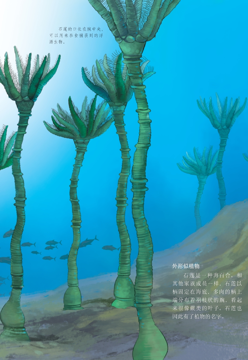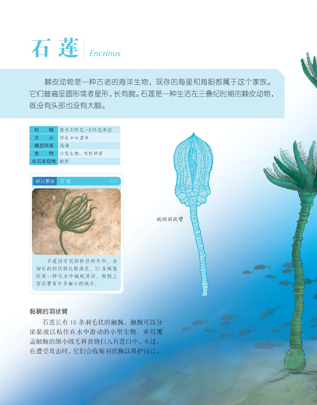 棘皮动物是一种古老的海洋生物,现存的海星和海胆都属于这个家族。它们普遍呈圆形或者星形,长有腕。石莲是一种生活在三叠纪时期的棘皮动物,既没有头部也没有大脑。