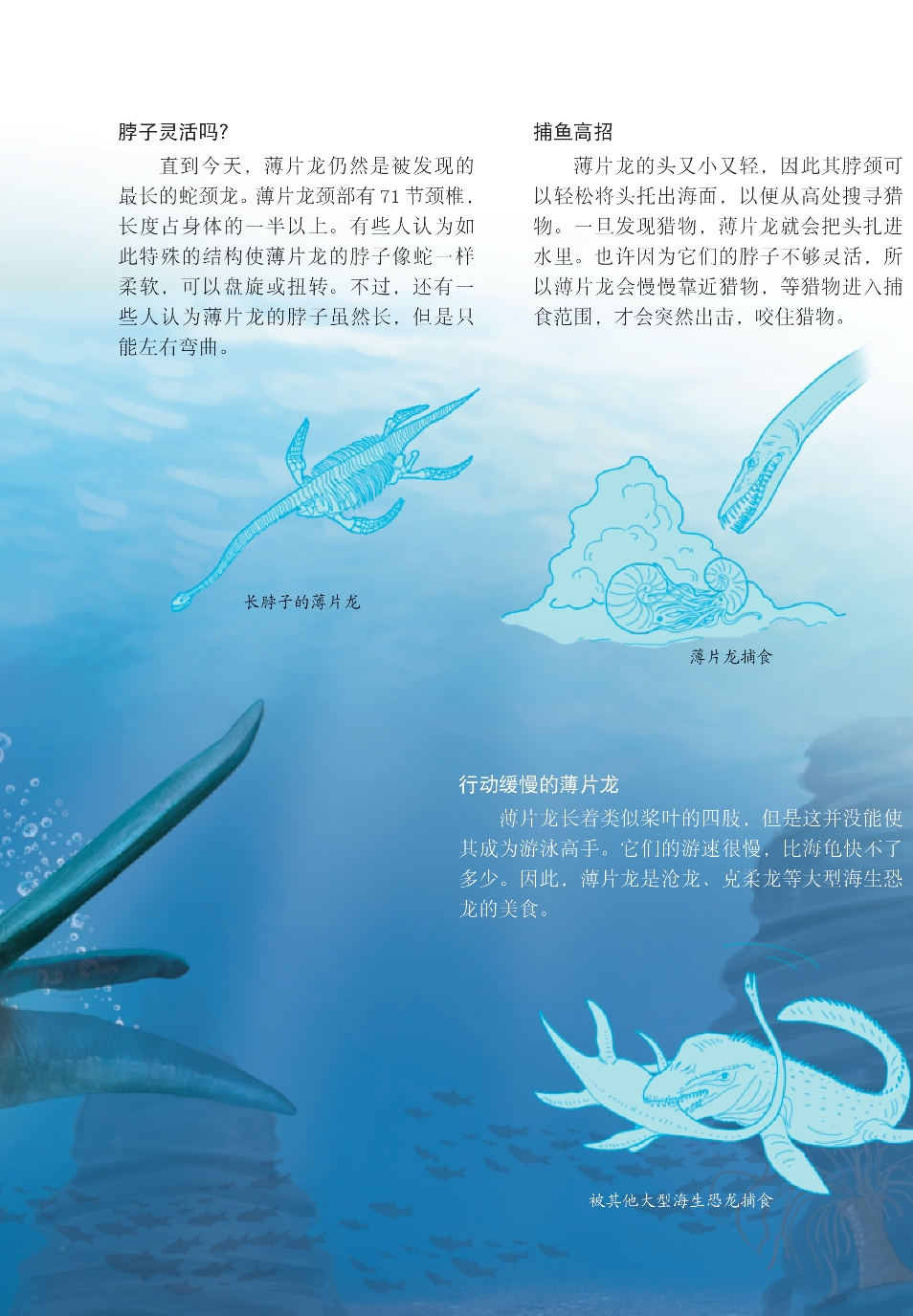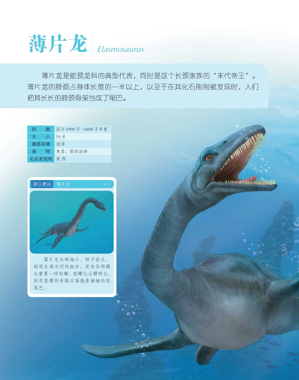 薄片龙是蛇颈龙科的典型代表,同时是这个长颈家族的“末代帝王”。薄片龙的脖颈占身体长度的一半以上,以至于在其化石刚刚被发现时,人们把其长长的脖颈骨架当成了尾巴。
