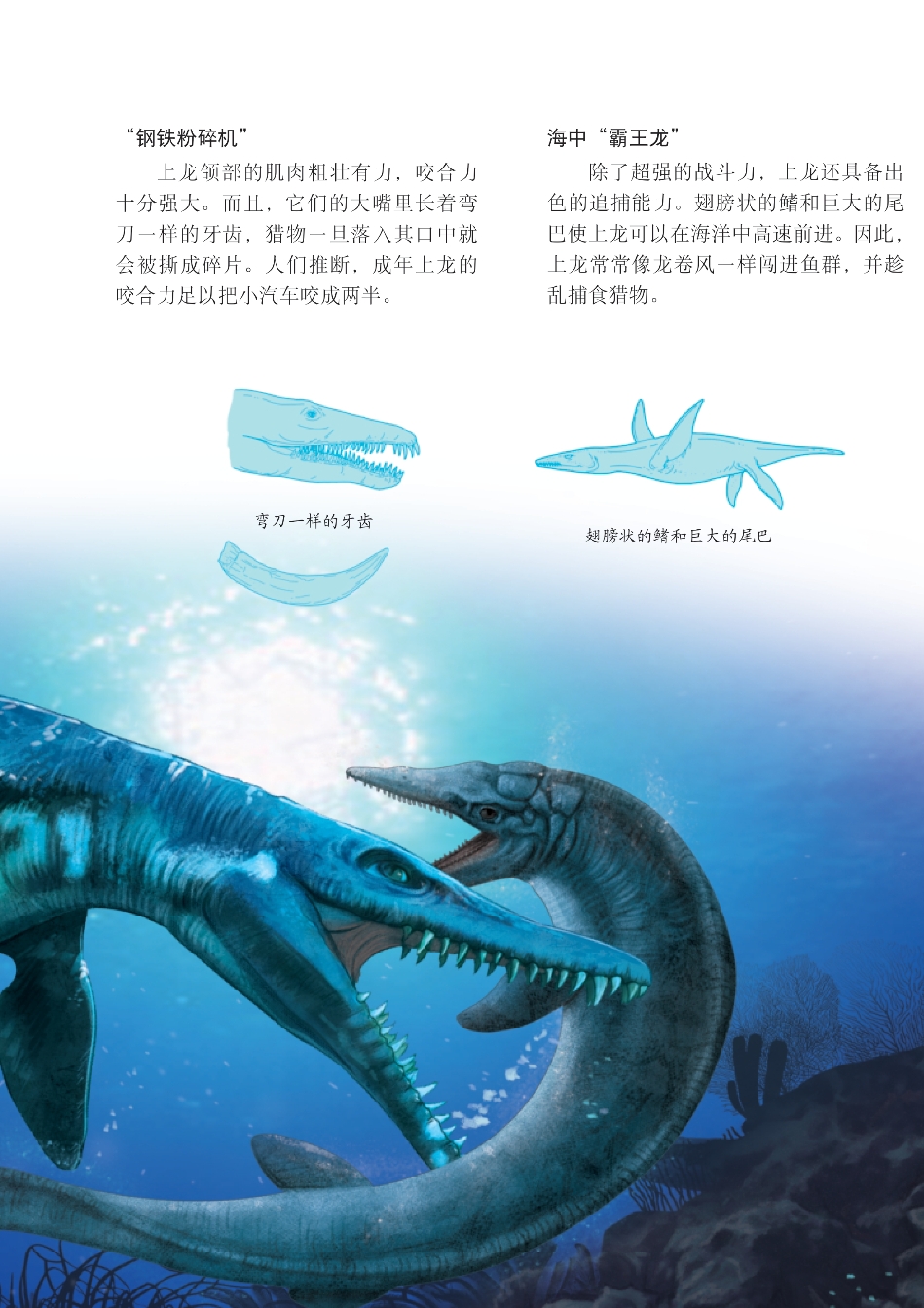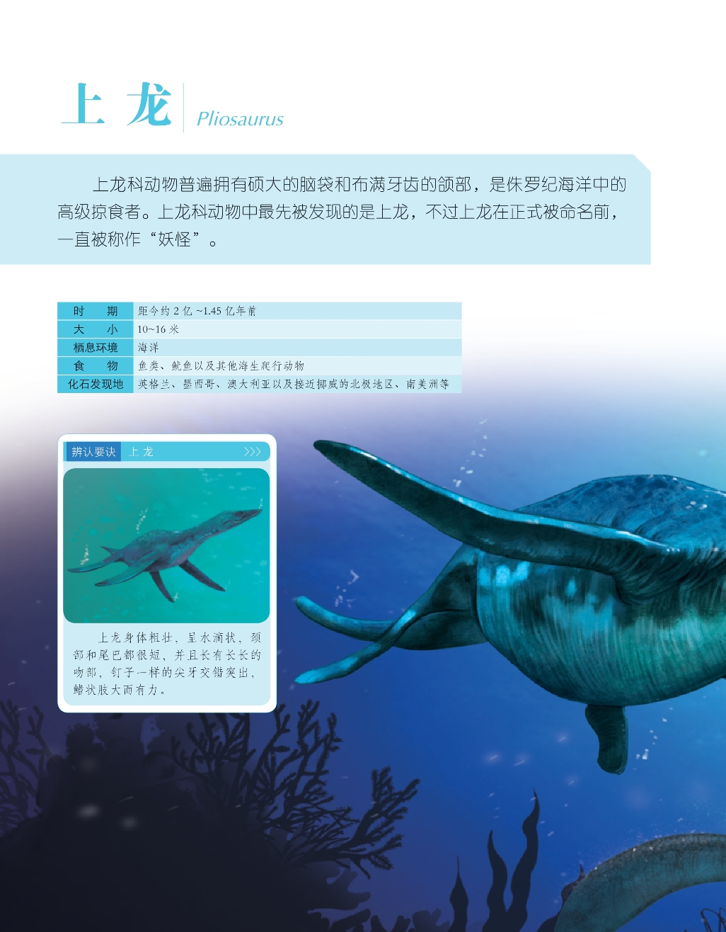上龙科动物普遍拥有硕大的脑袋和布满牙齿的颌部,是侏罗纪海洋中的高级掠食者。上龙科动物中最先被发现的是上龙,不过上龙在正式被命名前,一直被称作“妖怪”。