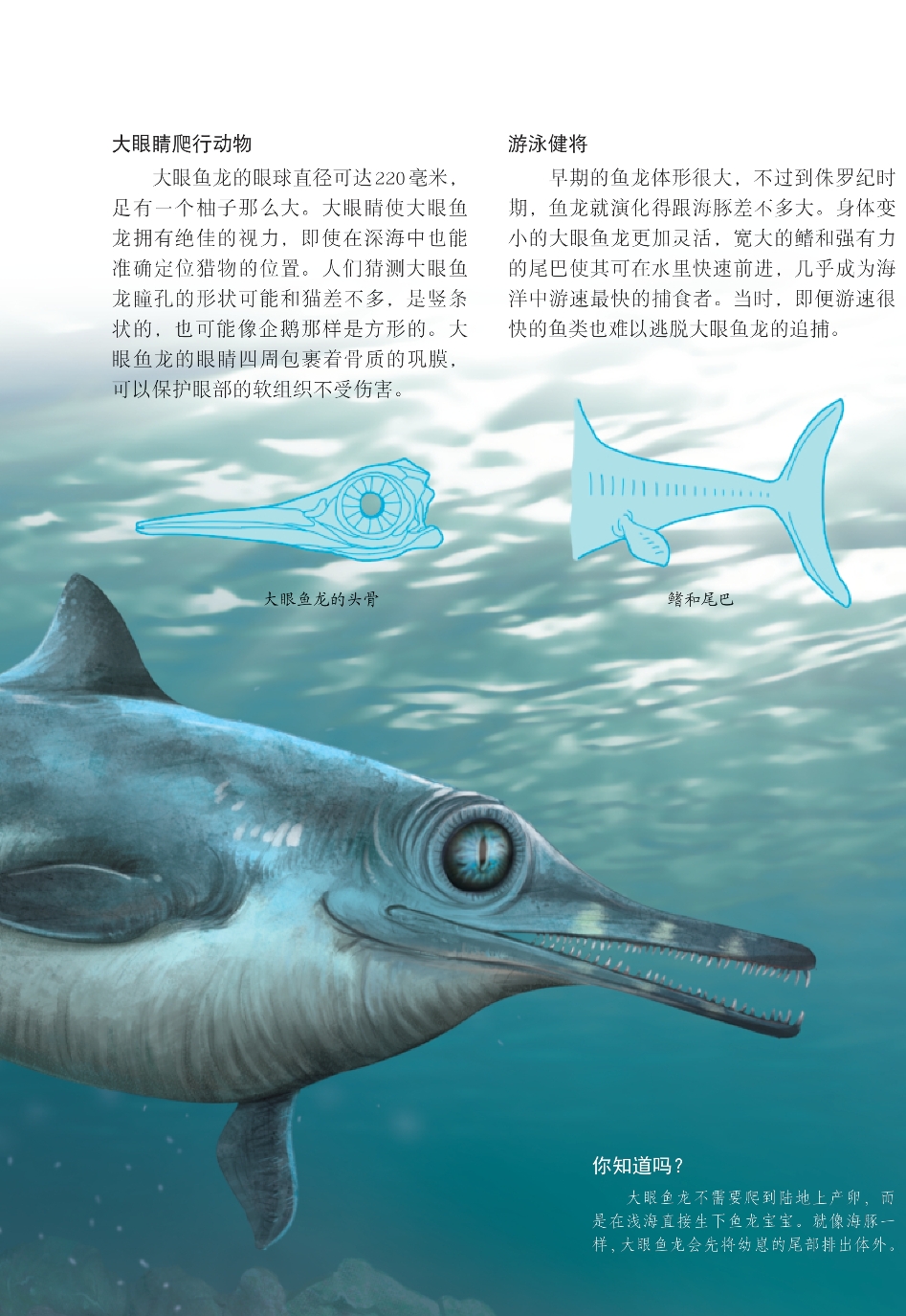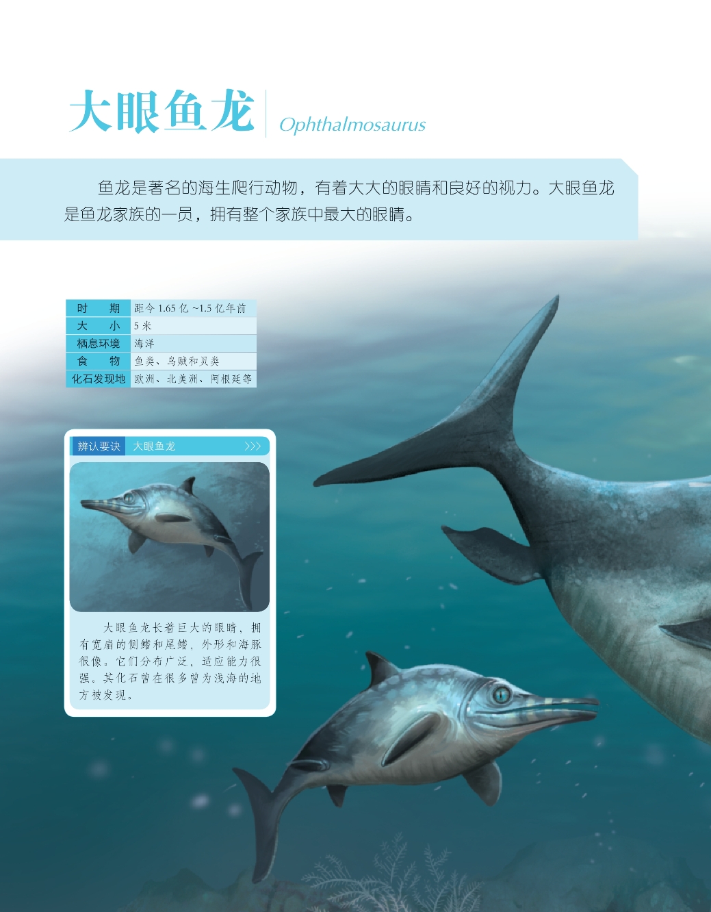 鱼龙是著名的海生爬行动物,有着大大的眼睛和良好的视力。大眼鱼龙是鱼龙家族的一员,拥有整个家族中最大的眼睛。