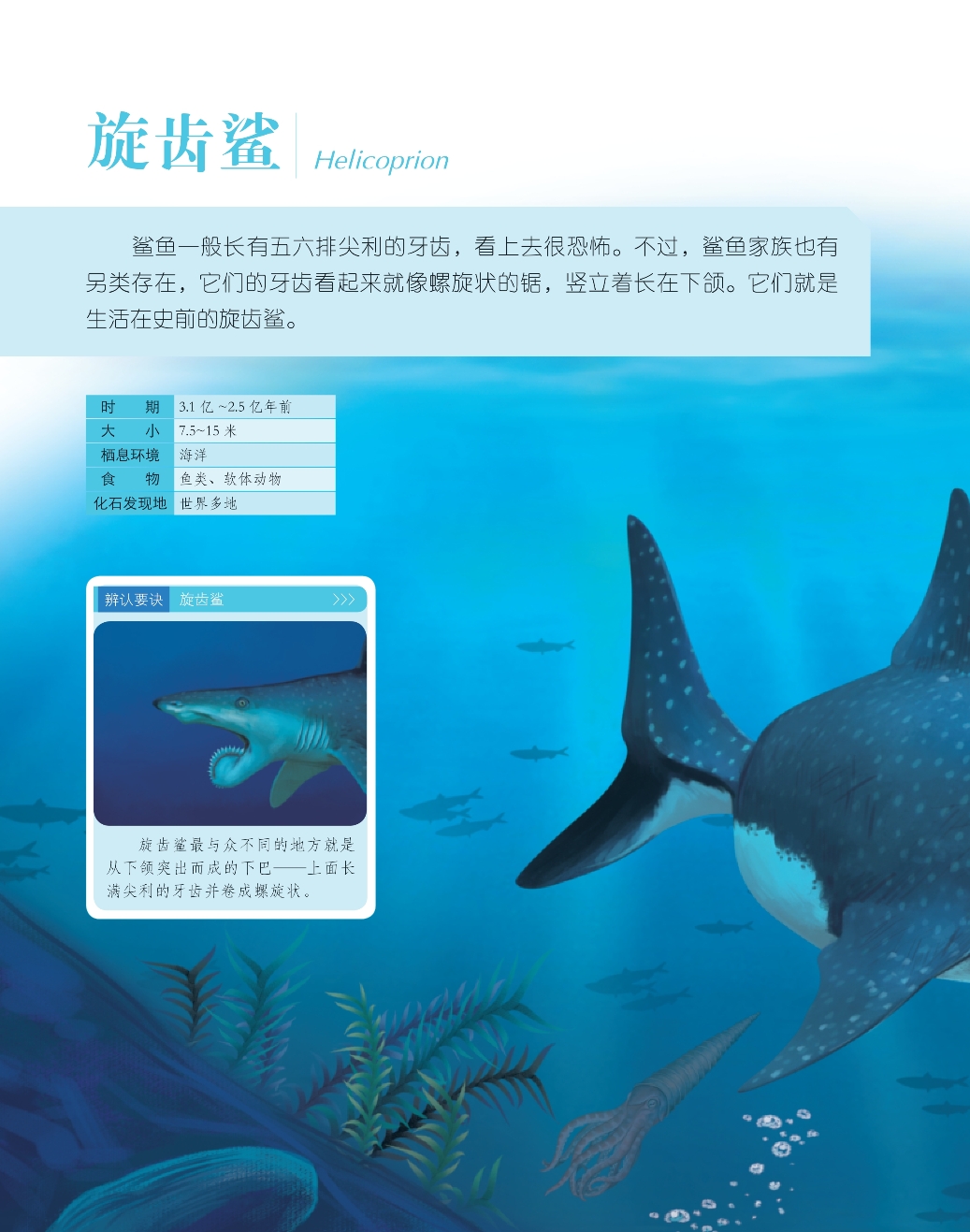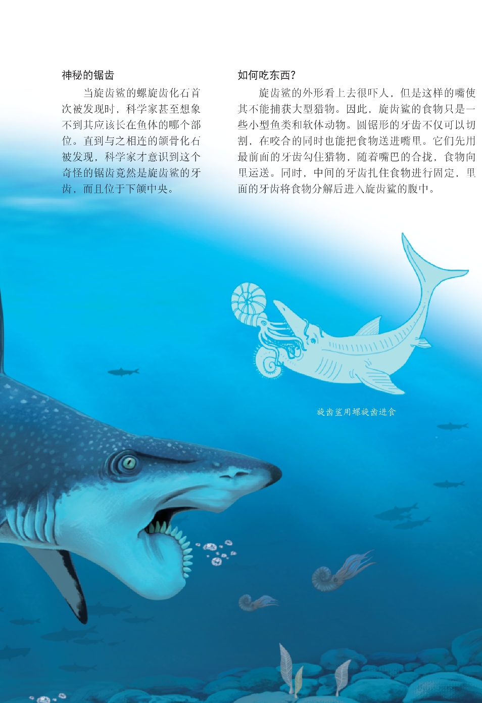 鲨鱼一般长有五六排尖利的牙齿,看上去很恐怖。不过,鲨鱼家族也有另类存在,它们的牙齿看起来就像螺旋状的锯,竖立着长在下颌。它们就是生活在史前的旋齿鲨。
