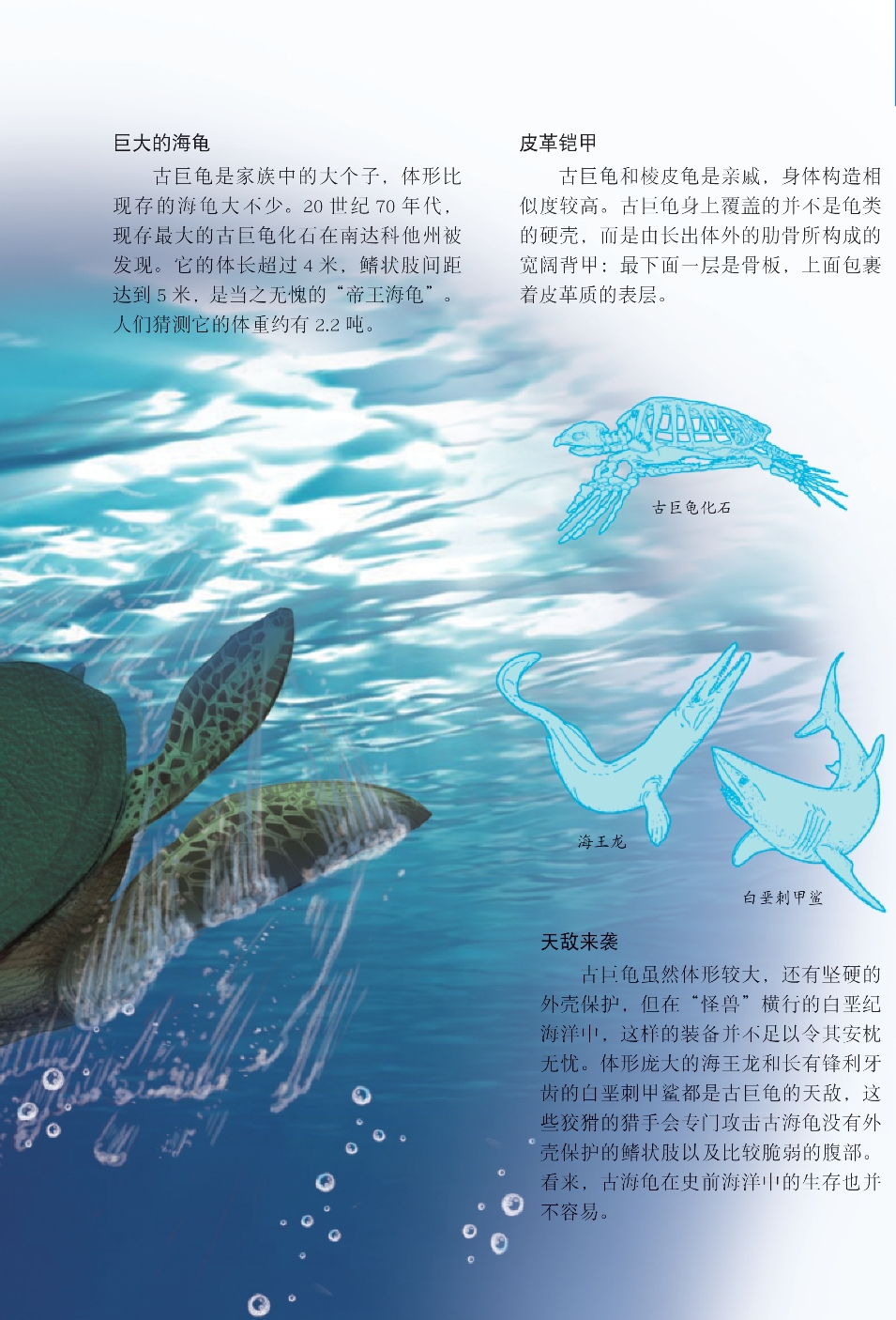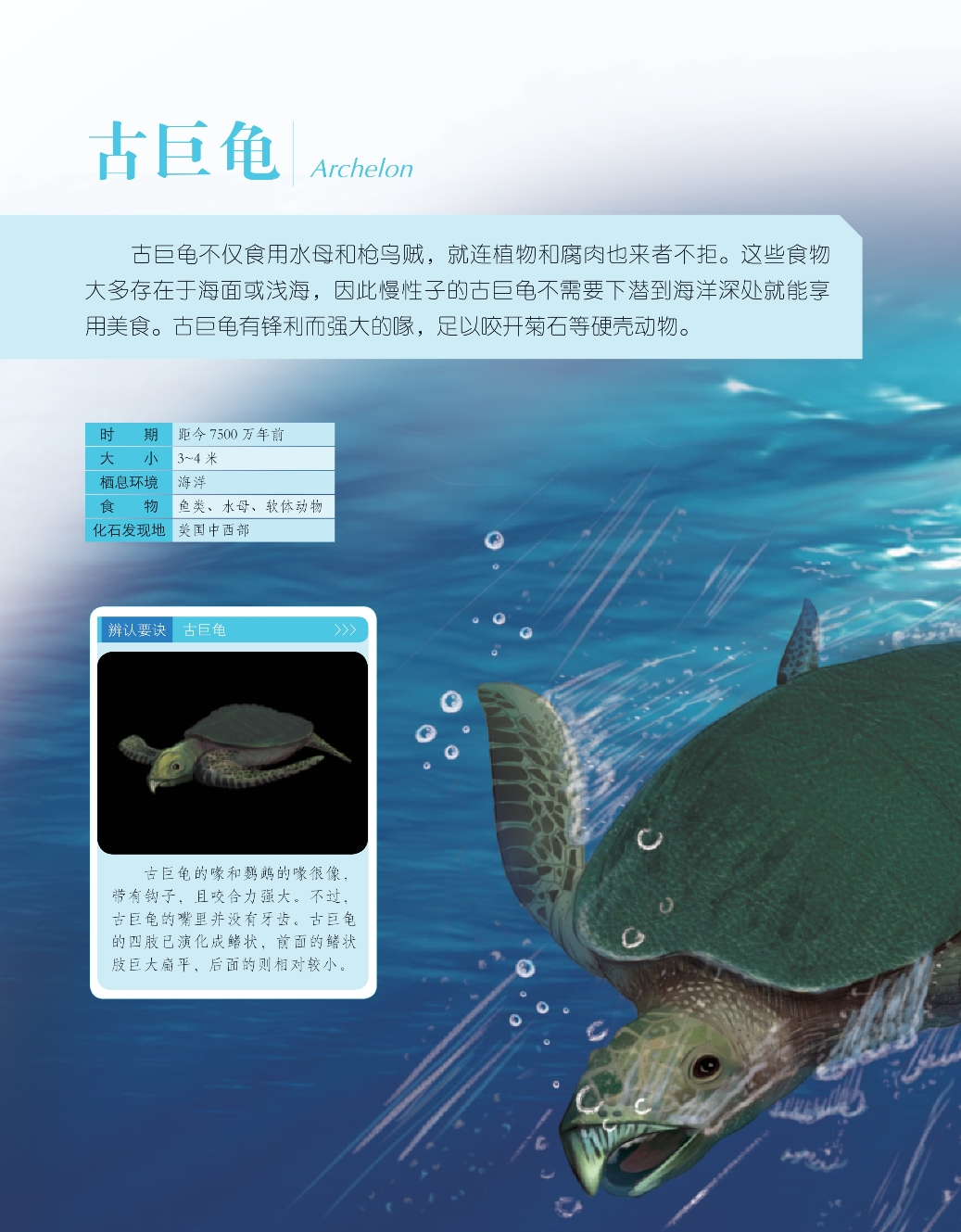 古巨龟不仅食用水母和枪乌贼,就连植物和腐肉也来者不拒。这些食物大多存在于海面或浅海,因此慢性子的古巨龟不需要下潜到海洋深处就能享用美食。古巨龟有锋利而强大的喙,足以咬开菊石等硬壳动物。