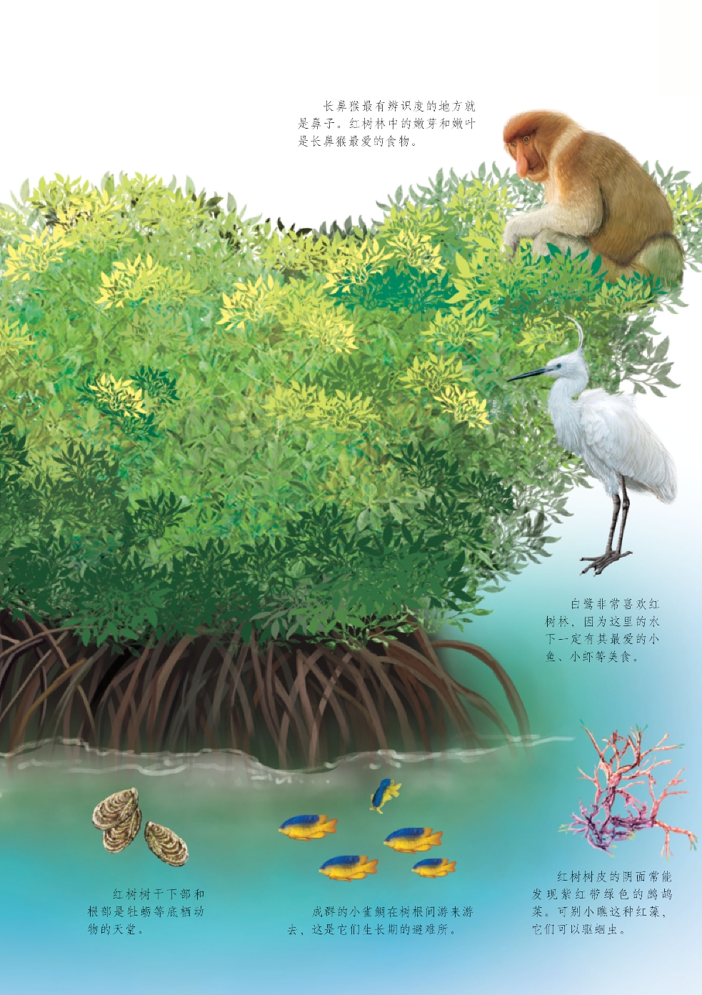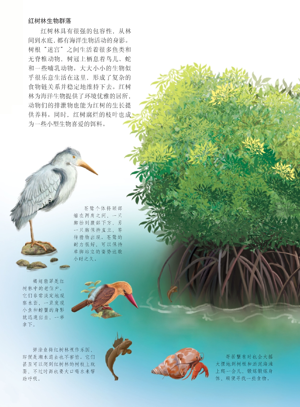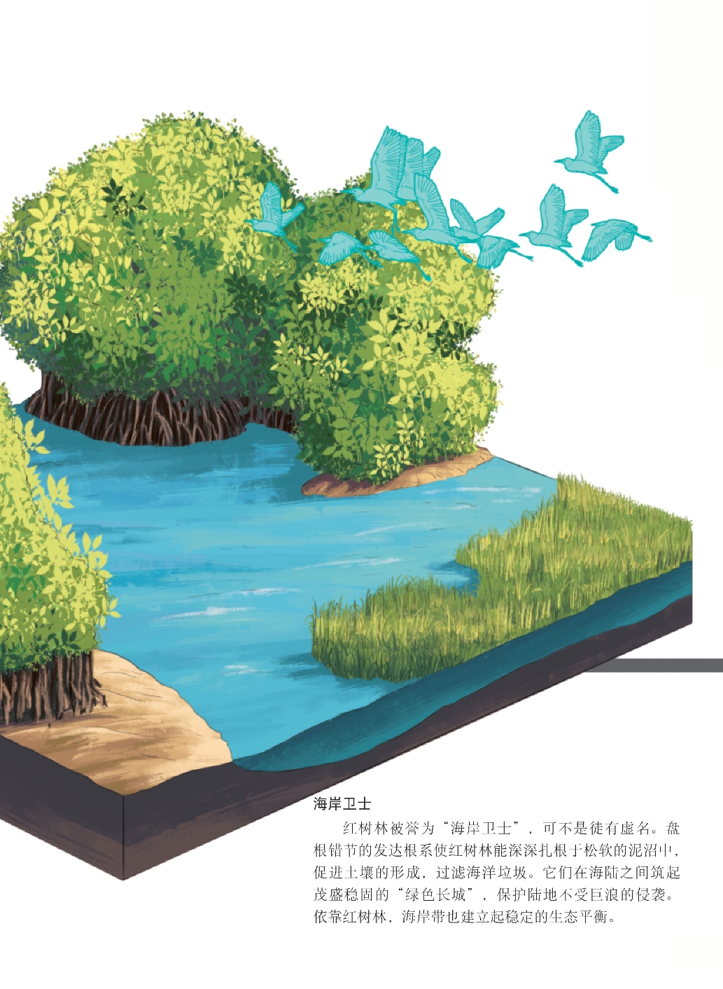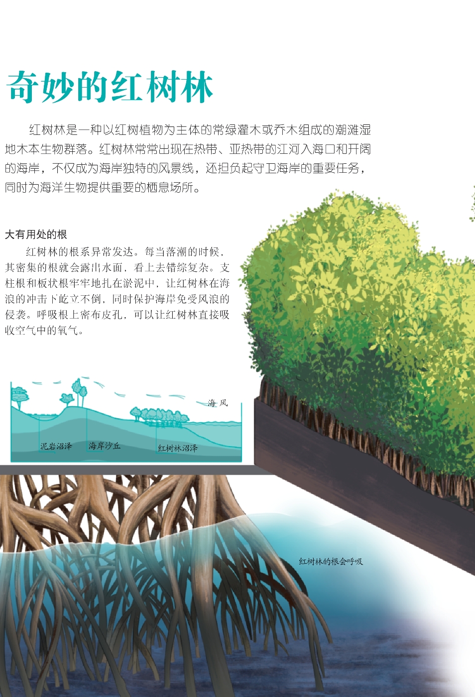 红树林是一种以红树植物为主体的常绿灌木或乔木组成的潮滩湿地木本生物群落。红树林常常出现在热带、亚热带的江河入海口和开阔的海岸,不仅成为海岸独特的风景线,还担负起守卫海岸的重要任务,同时为海洋生物提供重要的栖息场所。