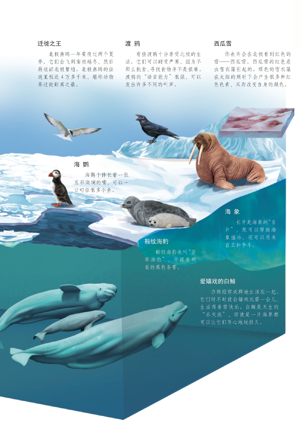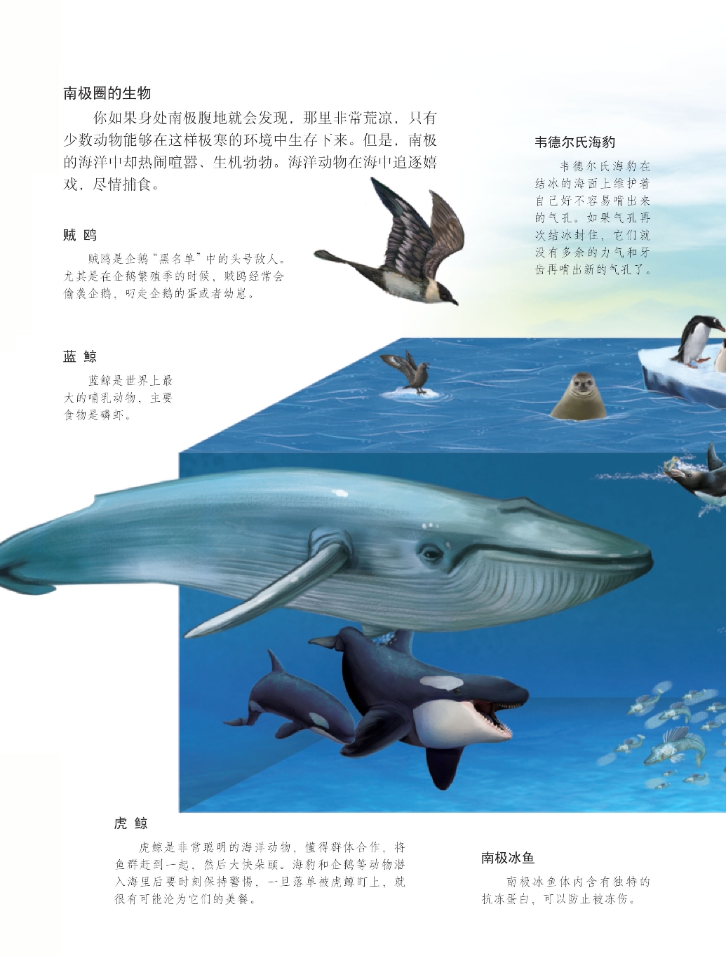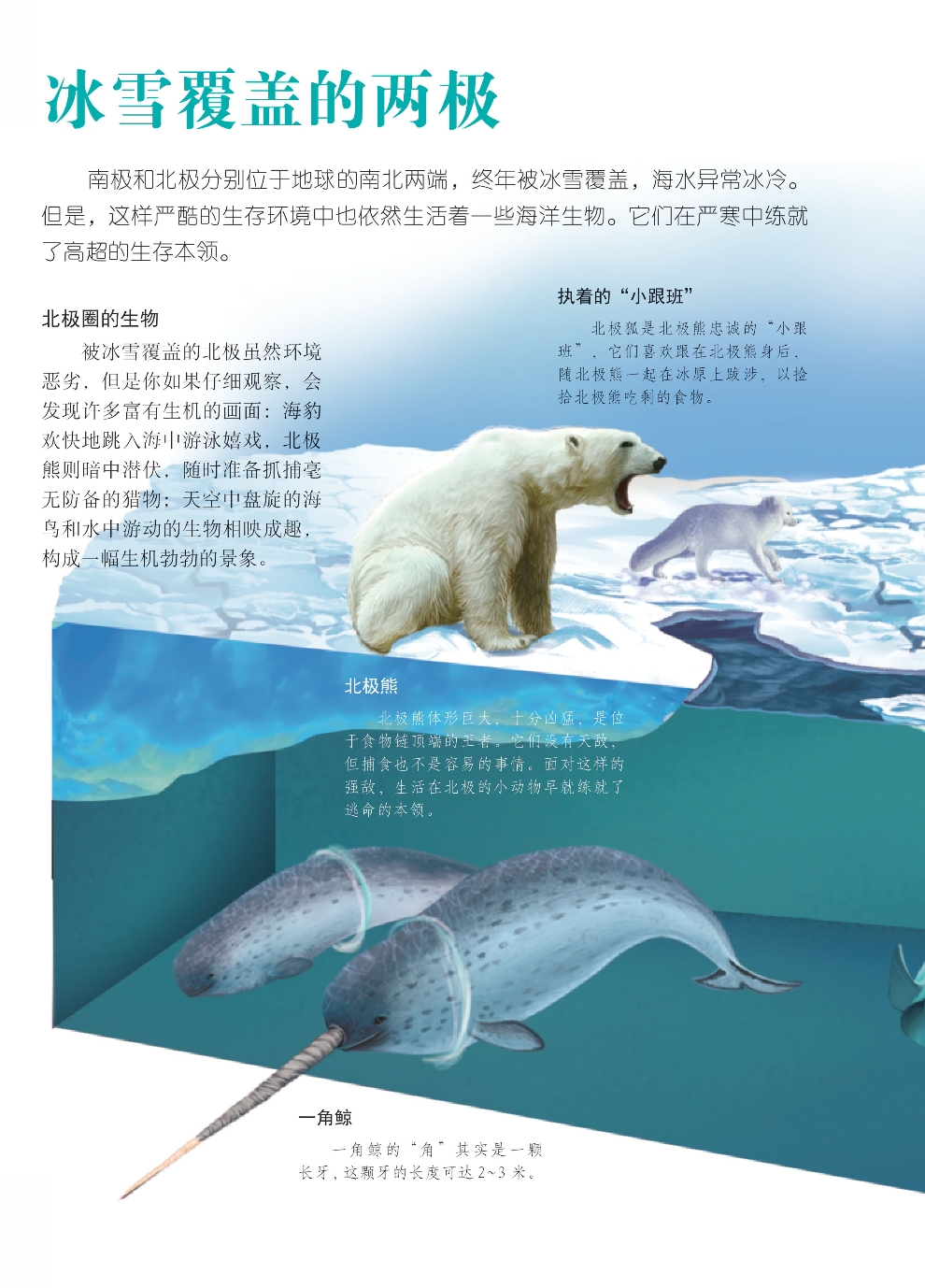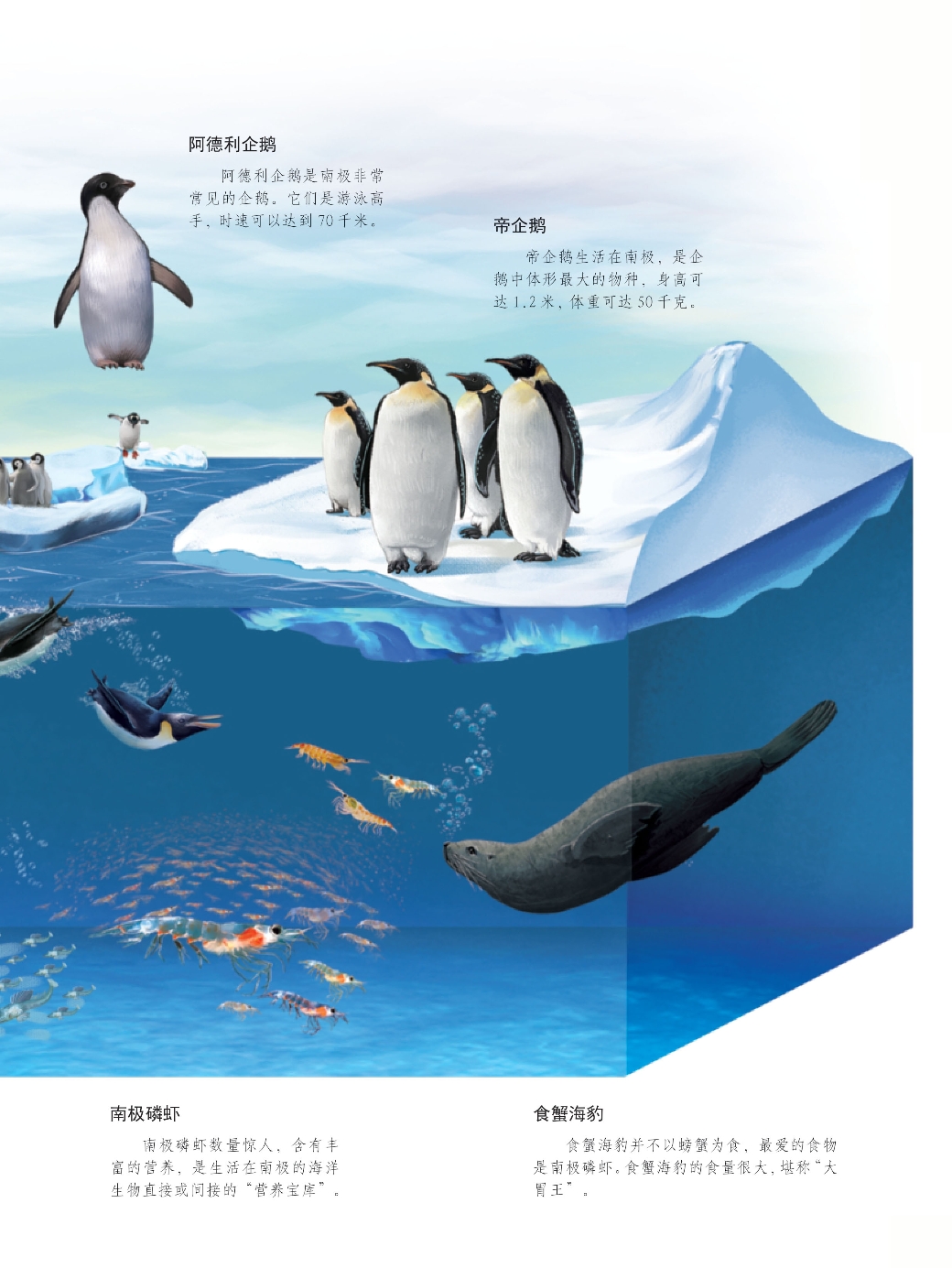 南极和北极分别位于地球的南北两端,终年被冰雪覆盖,海水异常冰冷。但是,这样严酷的生存环境中也依然生活着一些海洋生物。它们在严寒中练就了高超的生存本领。
