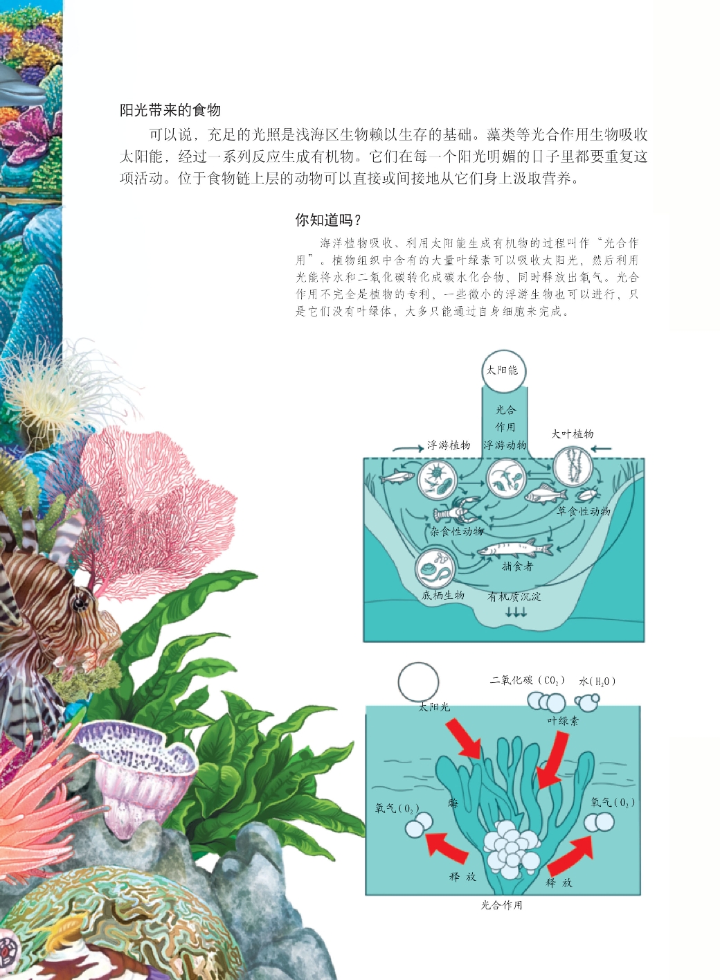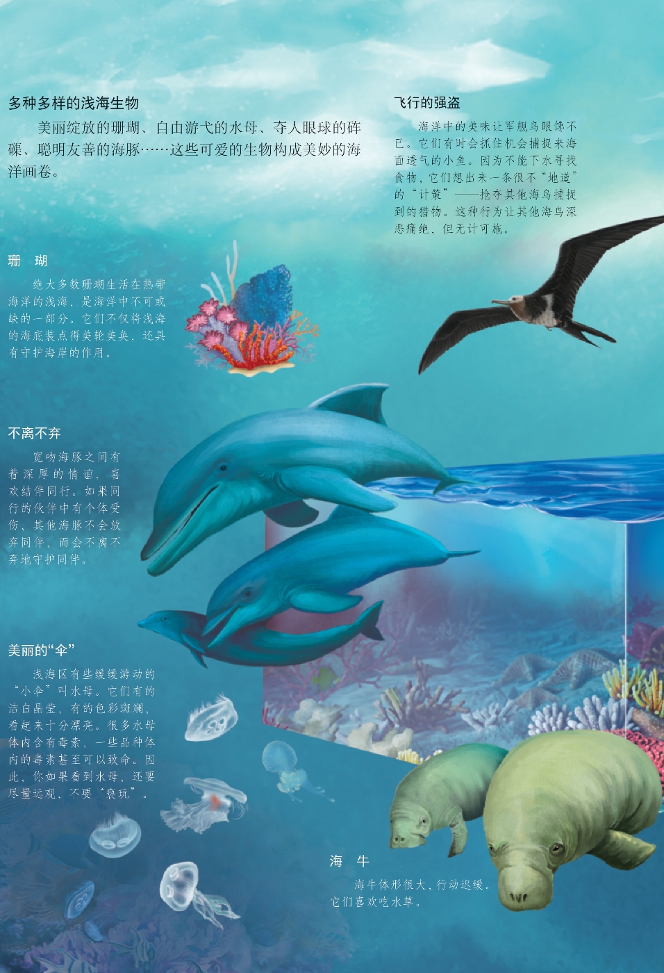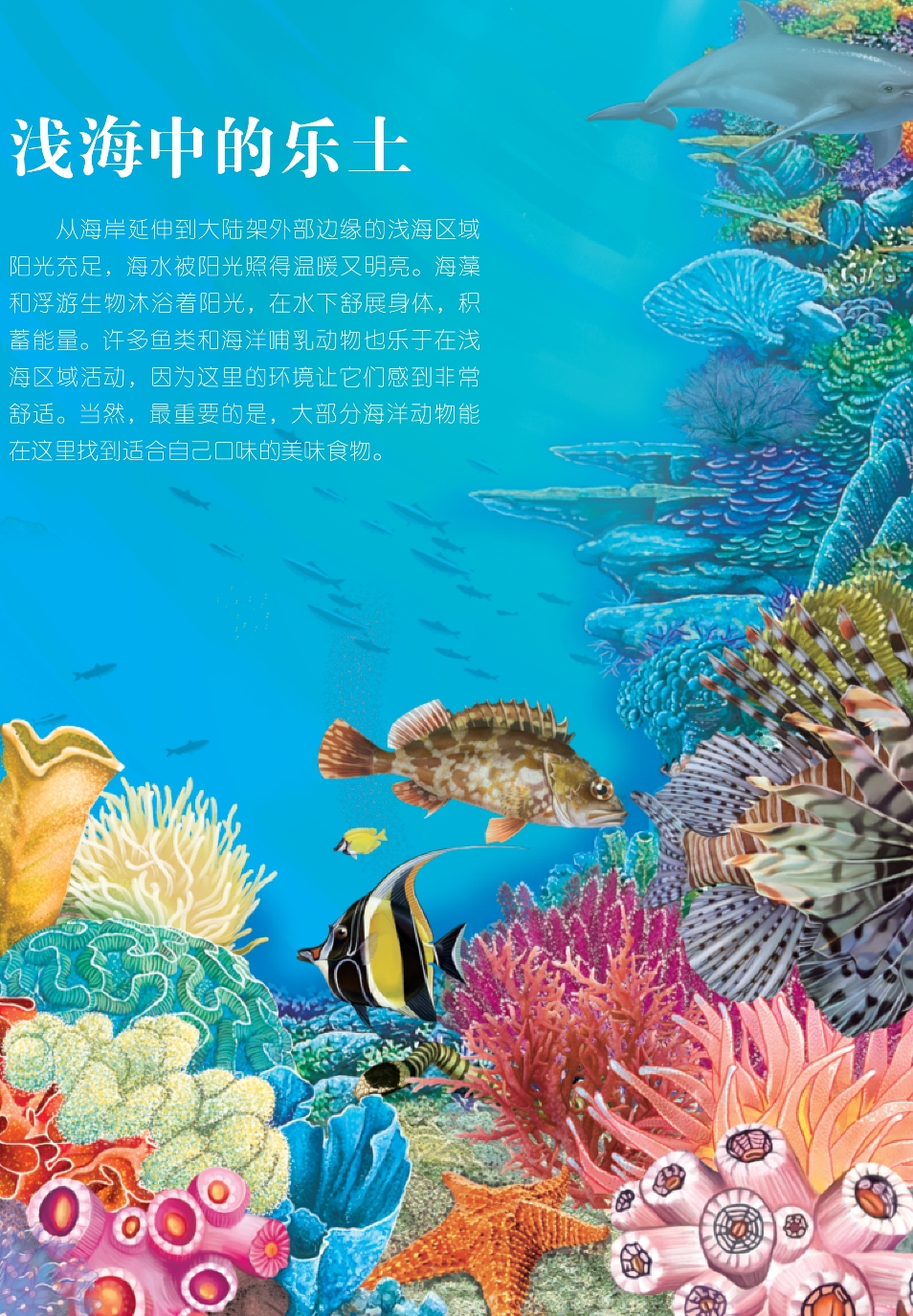 从海岸延伸到大陆架外部边缘的浅海区域阳光充足,海水被阳光照得温暖又明亮。海藻和浮游生物沐浴着阳光,在水下舒展身体,积蓄能量。许多鱼类和海洋哺乳动物也乐于在浅海区域活动,因为这里的环境让它们感到非常舒适。当然,最重要的是,大部分海洋动物能在这里找到适合自己口味的美味食物。