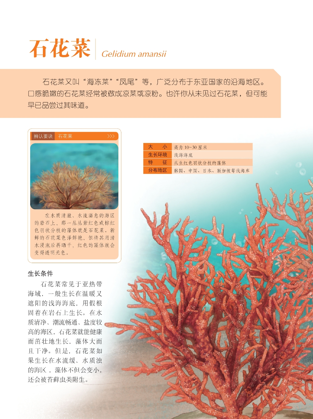 石花菜又叫“海冻菜”“凤尾”等,广泛分布于东亚国家的沿海地区。口感脆嫩的石花菜经常被做成凉菜或凉粉。也许你从未见过石花菜,但可能早已品尝过其味道。