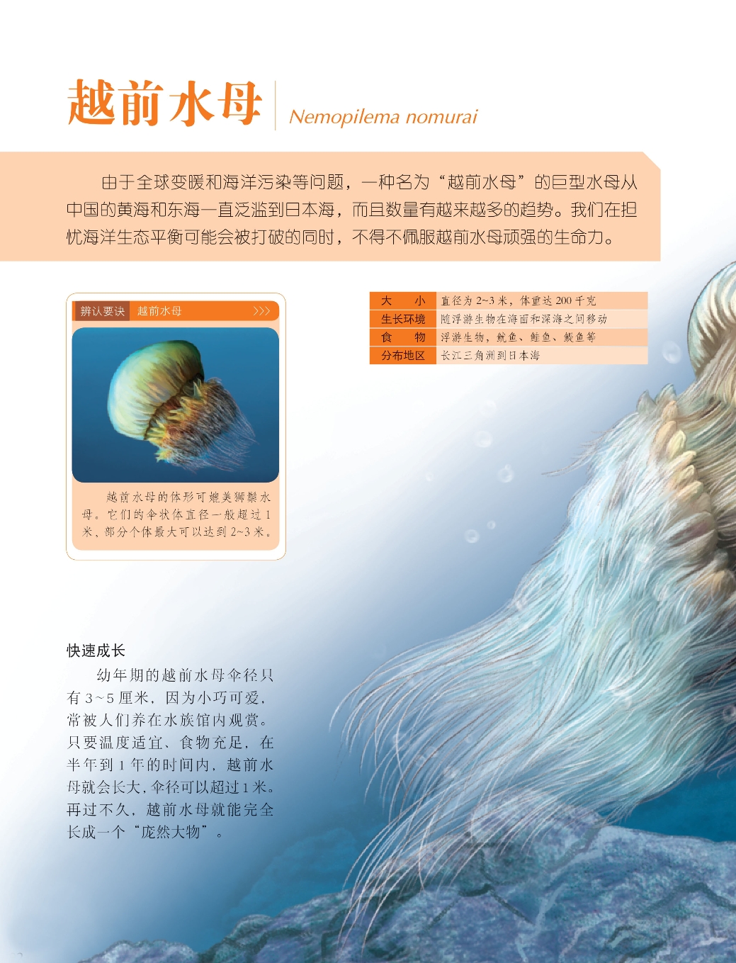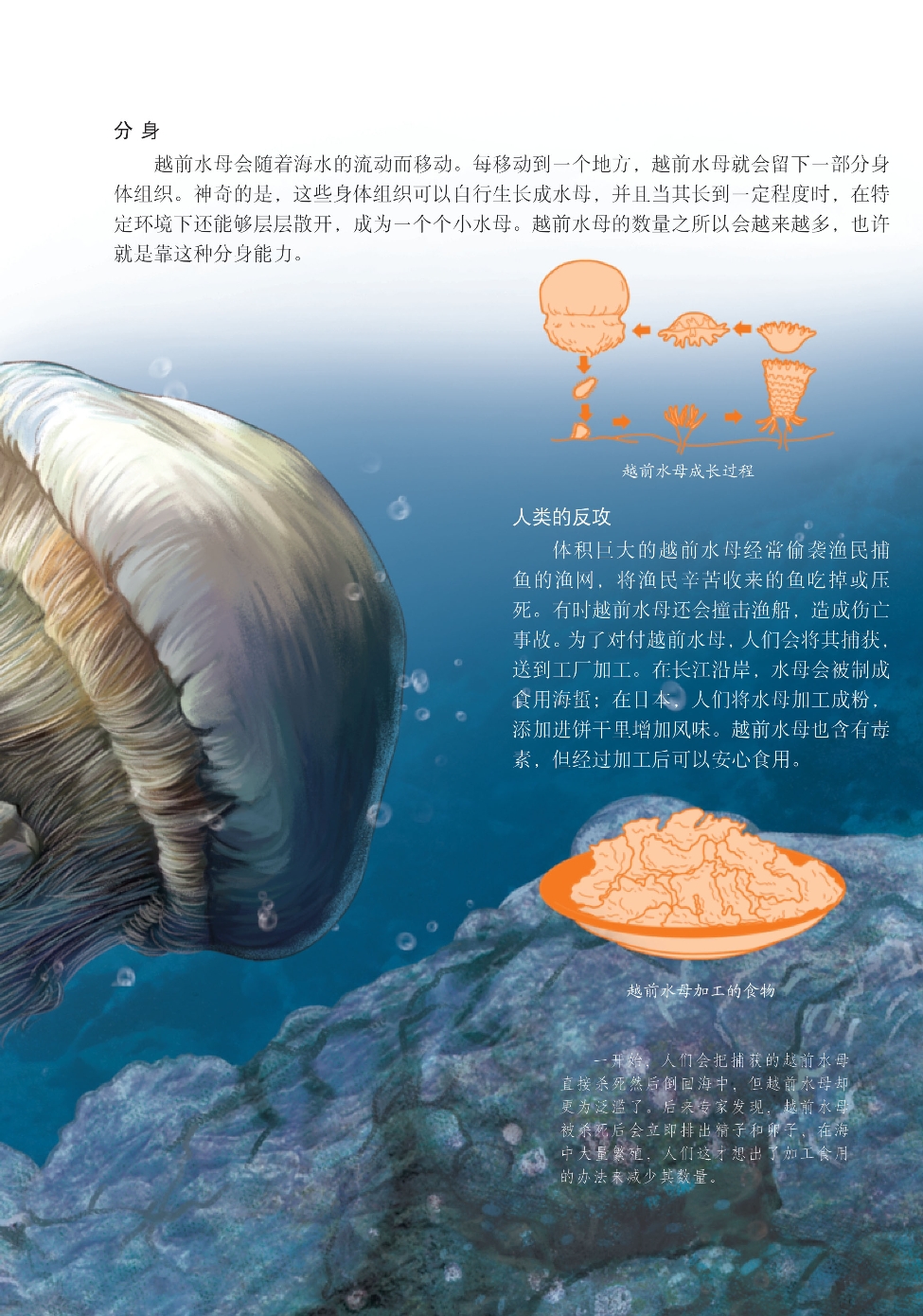由于全球变暖和海洋污染等问题,一种名为“越前水母”的巨型水母从中国的黄海和东海一直泛滥到日本海,而且数量有越来越多的趋势。我们在担忧海洋生态平衡可能会被打破的同时,不得不佩服越前水母顽强的生命力。