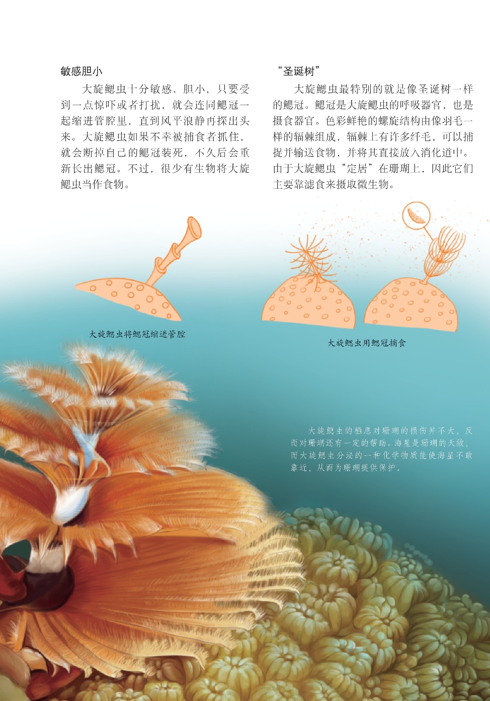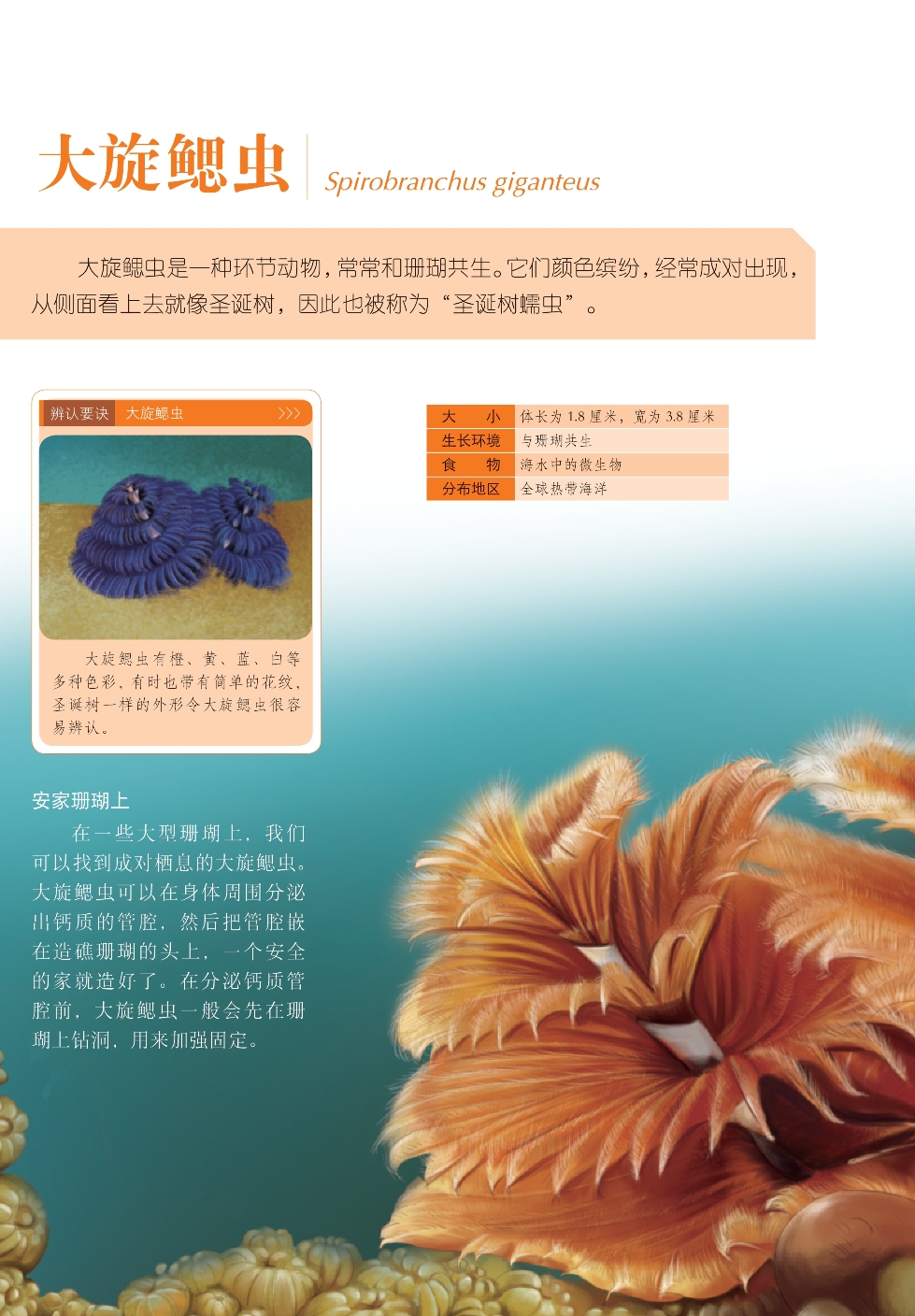 大旋鳃虫是一种环节动物,常常和珊瑚共生。它们颜色缤纷,经常成对出现,从侧面看上去就像圣诞树,因此也被称为“圣诞树蠕虫”。