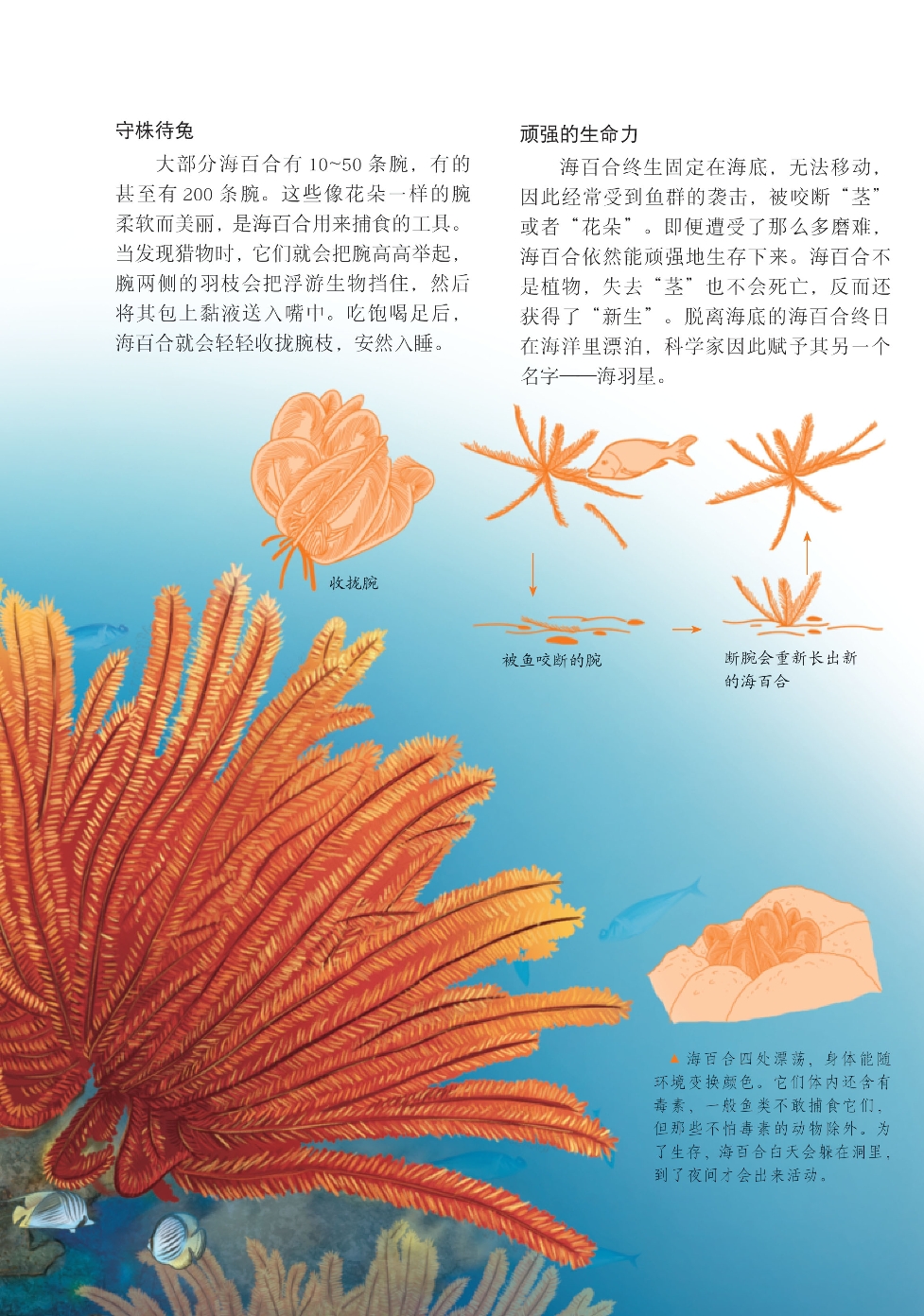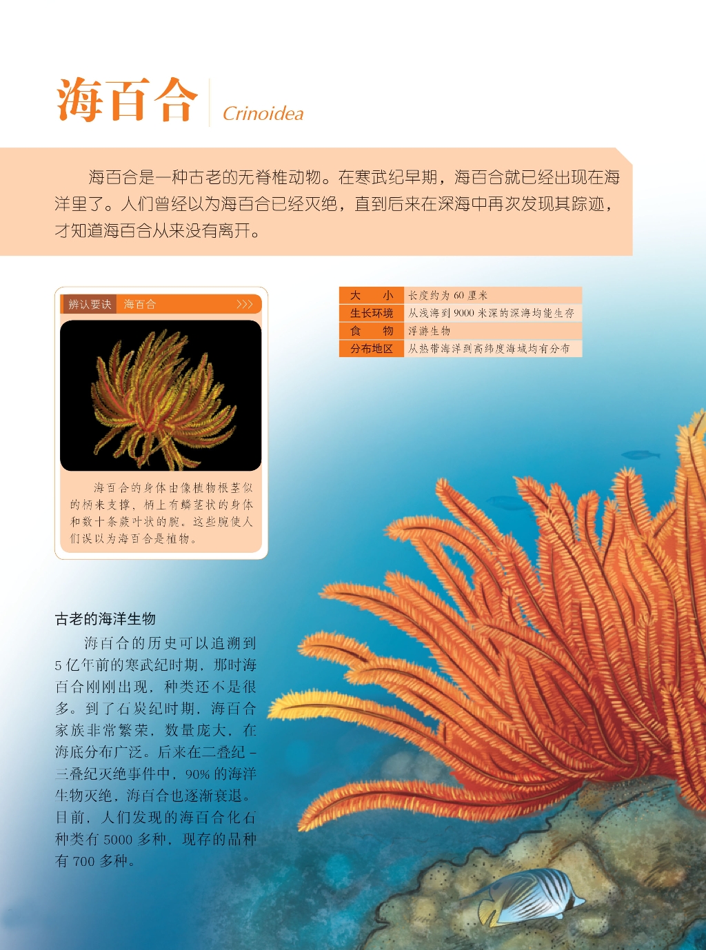 海百合是一种古老的无脊椎动物。在寒武纪早期,海百合就已经出现在海洋里了。人们曾经以为海百合已经灭绝,直到后来在深海中再次发现其踪迹,才知道海百合从来没有离开。