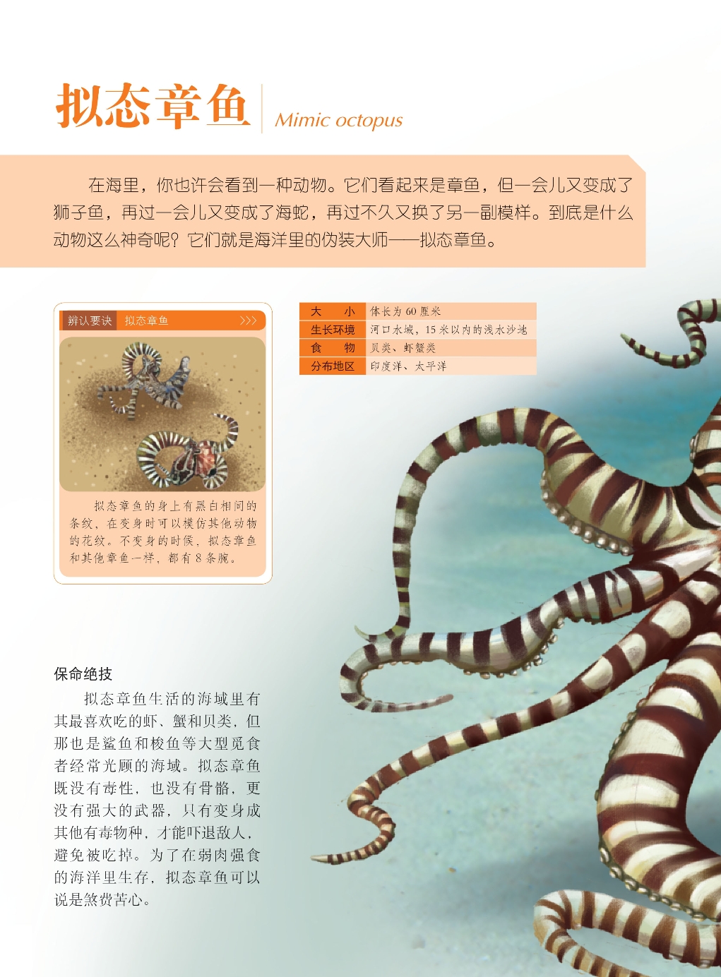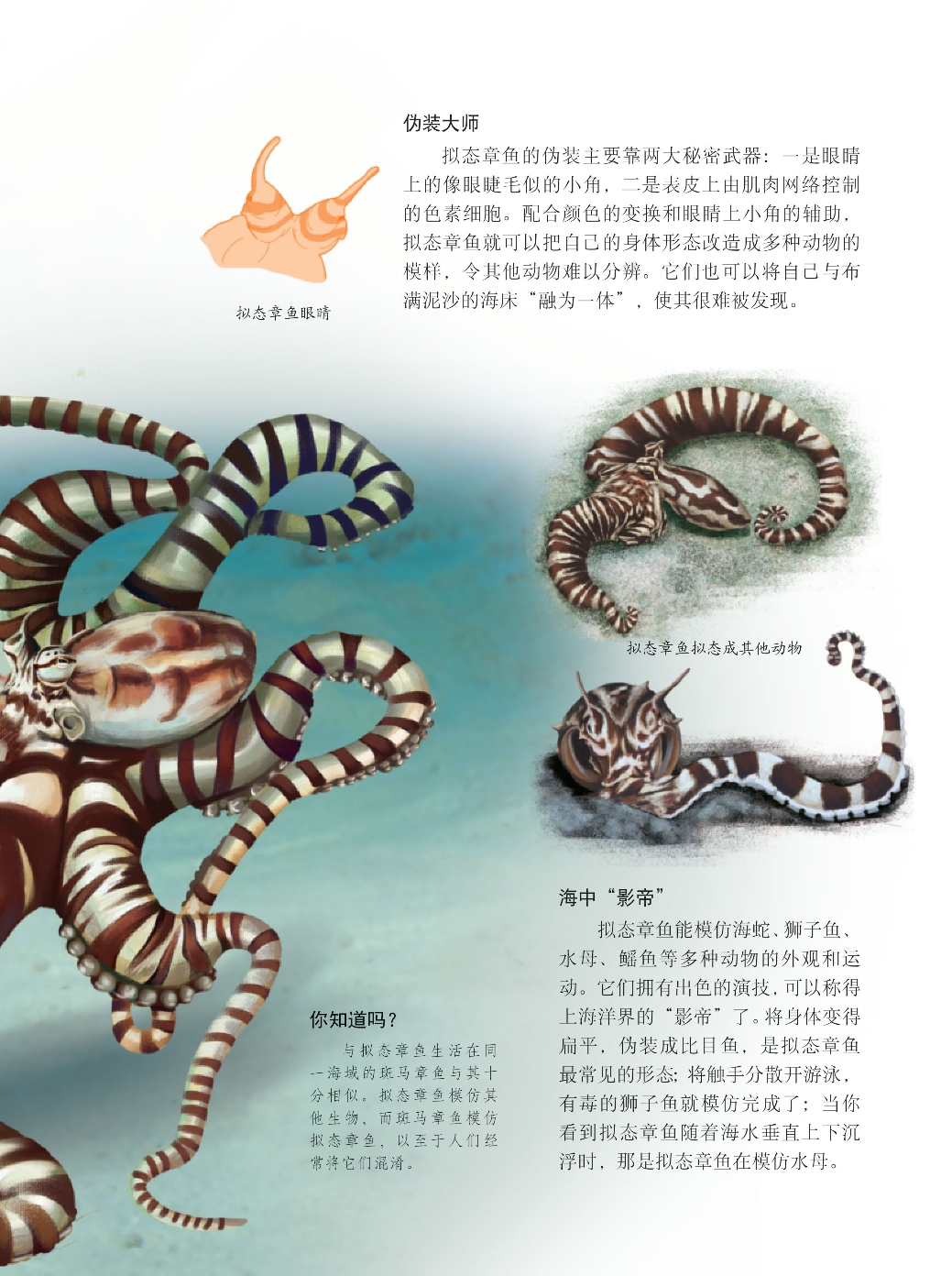 在海里,你也许会看到一种动物。它们看起来是章鱼,但一会儿又变成了狮子鱼,再过一会儿又变成了海蛇,再过不久又换了另一副模样。到底是什么动物这么神奇呢?它们就是海洋里的伪装大师——拟态章鱼。