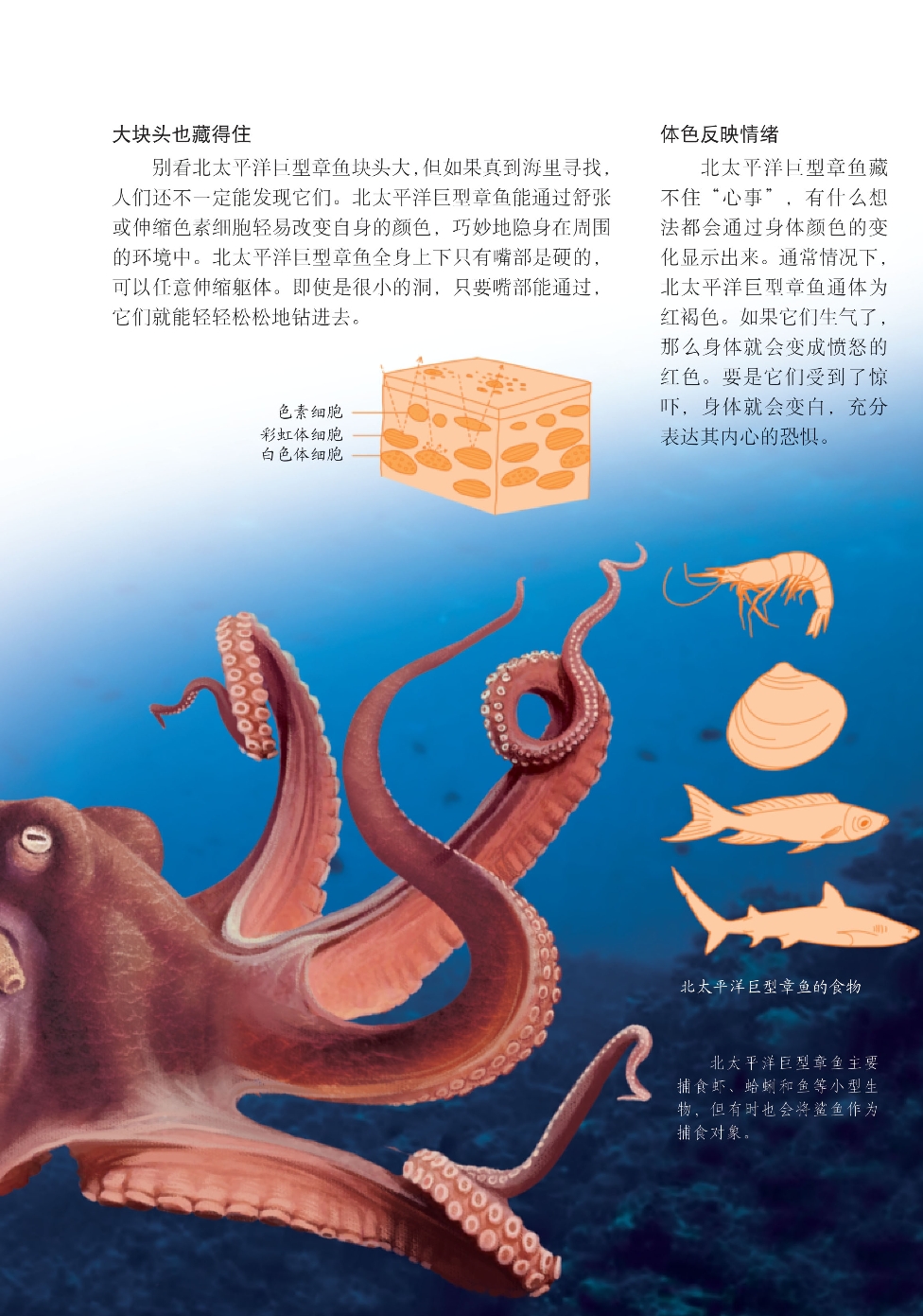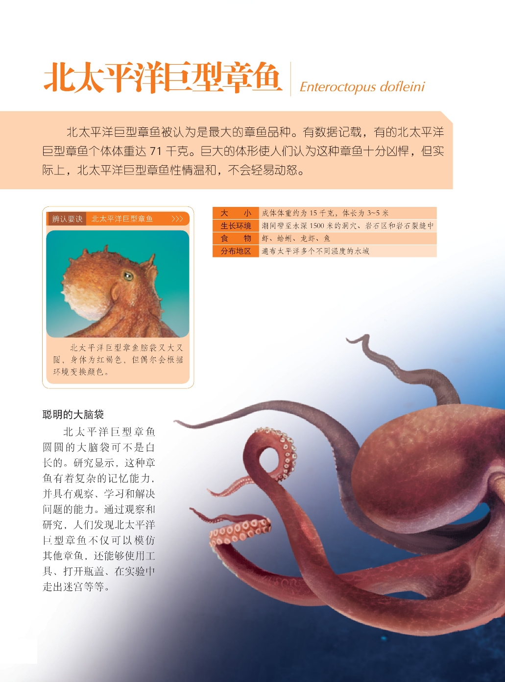 北太平洋巨型章鱼被认为是最大的章鱼品种。有数据记载,有的北太平洋巨型章鱼个体体重达71千克。巨大的体形使人们认为这种章鱼十分凶悍,但实际上,北太平洋巨型章鱼性情温和,不会轻易动怒。