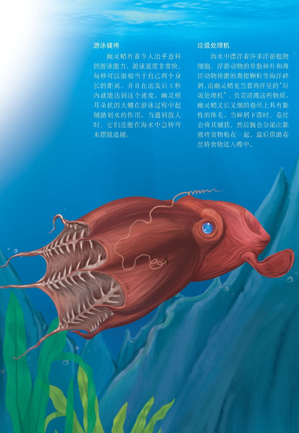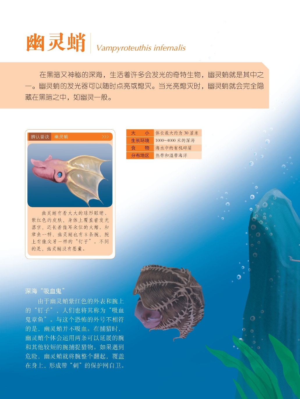 在黑暗又神秘的深海,生活着许多会发光的奇特生物,幽灵蛸就是其中之一。幽灵蛸的发光器可以随时点亮或熄灭。当光亮熄灭时,幽灵蛸就会完全隐藏在黑暗之中,如幽灵一般。