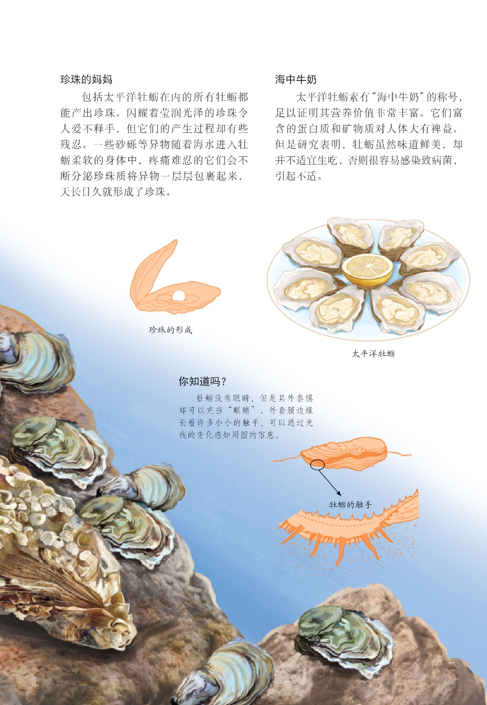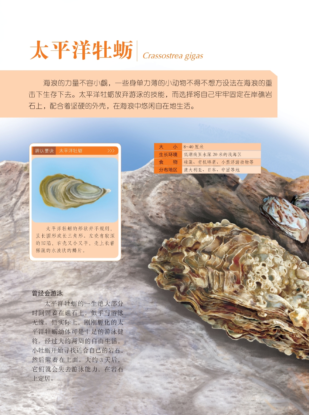 海浪的力量不容小觑,一些身单力薄的小动物不得不想方设法在海浪的重击下生存下去。太平洋牡蛎放弃游泳的技能,而选择将自己牢牢固定在岸礁岩石上,配合着坚硬的外壳,在海浪中悠闲自在地生活。